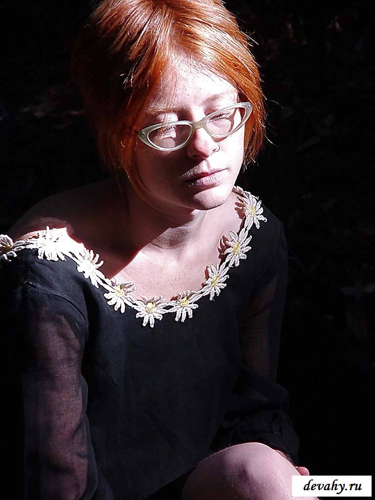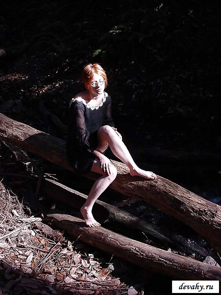 Голая рыженькая девушка подалась в движение хиппи. И вот теперь она постоянно одевается как представители этого движения и предпочитает отдыхать на природе в лесу. Однажды эта блудница пока ее лагерь раскладывался, решила пройтись по зарослям, сняв с себя всю одежду и показав обнаженную киску, где имеются также волосы рыжего цвета. От таких прогулок сучка получила неповторимое удовольствие особенно, когда по ее тельцу начали скользить листки зеленого цвета.