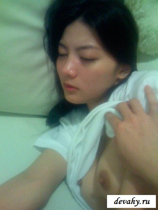 Славная и застенчивая молоденькая азиатскую студентку застукали спящей в обнаженном виде, ну либо по крайней мере слегка дремлющей. Пока она прикидывалась спящей, ее тайком сфоткали голой. Сначала девчонка лежала свернувшись калачиком, после раскинула ножки, и волосатая промежность свободно попала в кадр. А до этого, она только показывала титьки с прекрасными каштановыми сосками. Даже через футболку их довольно четко видно. И не понятно, почему этот народ так пренебрегает бритвой
