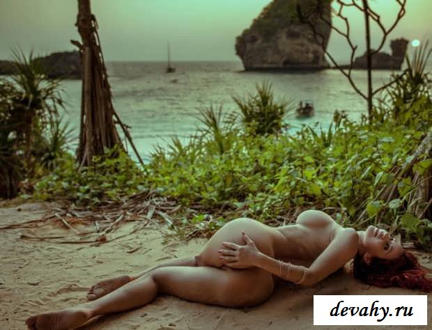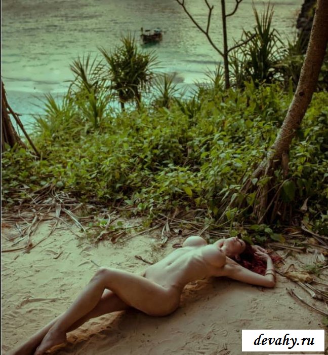 В тени на разогретом песке пляжа красивого экзотического острова. Голая в бикини рыжая красавица эффектно позирует, прислонившись спиной к стволу пальмы. Сука одним движением расстегивает вверх крохотного купальника, оголяя немыслимо крупные груди, садится на песок так, и теперь в центре внимание окажется ее впечатляющая попа; выставив длинные ноги рыжуха протягивает по ним трусики и нагишом нежится у морской воды, наслаждаясь теплотой и возможностью тут отдохнуть.