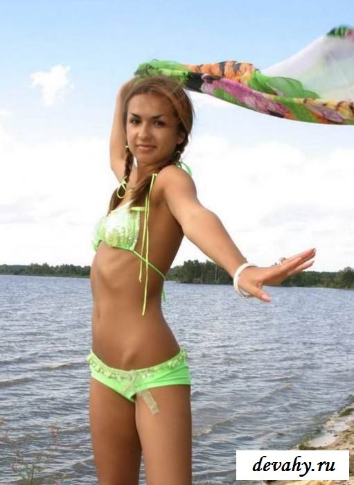 На берегу водоема сегодня было довольно прохладно, но маленькую сладенькую девчонку в салатовом бикини это ни как не остановило. Смугленькая цыпочка в крохотных трусиках не испугалась ветра, а сняла лифчик, обнажив маленькую грудь. Солнышко решило таки выглянуть и согреть хрупкое тело милашки. Малышка с косичками продолжит веселится, и не торопясь приступ к оголению фигурки. Прикрывая сиси руками она окажется с голой писюшкой с симпотной полоской волосиков на лобке, а на бедрах играет украшение.