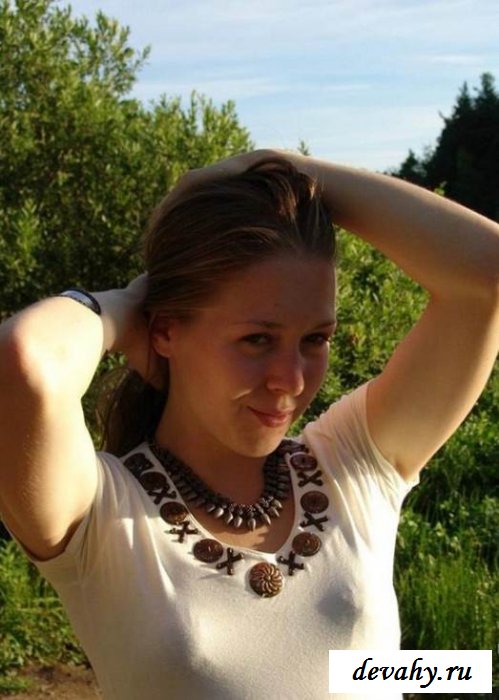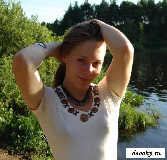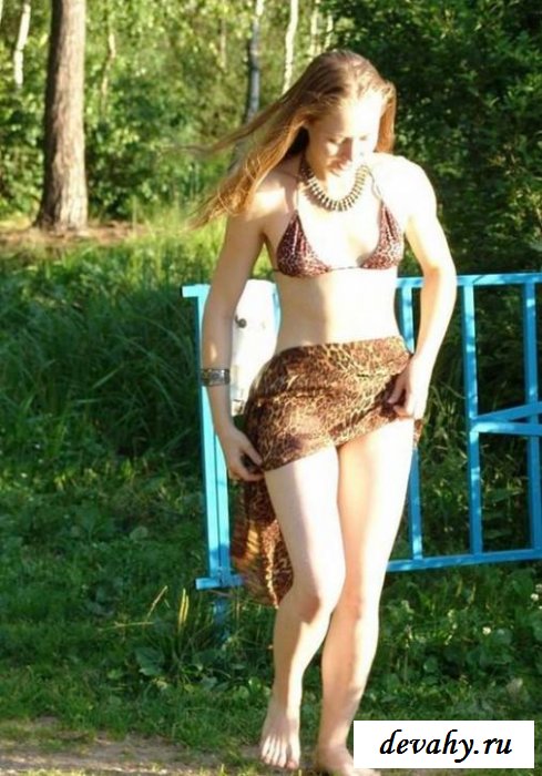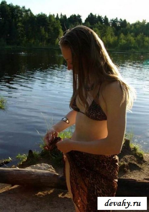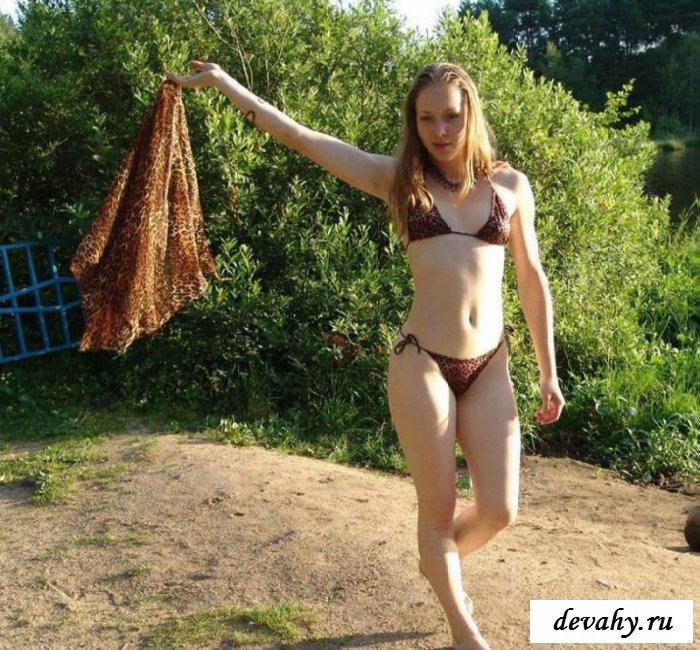 Очередная соблазнительница родом из маленького городка будет загорать и себя показывает. В этот раз с настоящей русской душой девка показать решила нам как купается в речке тигровом бикини, а потом покажет на фото как она обнаженной выжимает свой купальник. Под финиш можно сказать, что по традиции надо показать свою пилотку крупным планом. Собственно не скажешь что здесь прямо все идеально, но фигурка ни че так, небольшая грудь, пилотка с полоской волосиков в лобковом месте и попа по катят