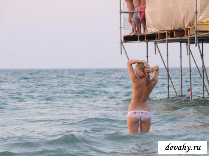Потрясающая девчонка рискнула поехать отдохнуть на Черном море и было ей на всех плевать и классно, как написано на ее трусиках, правильнее «ахуенно». Будучи в прекрасном настроением молодая блондинка сняла вверх от бикини оголив свою молоденькую, красивую грудь. Она купалась в таком виде, не обращая на хреновую погоду и глазеющих на молодые сиси ребят с пирса внимание.! Девушка естественно понимает, что она сексуальна и привлекательная, специально крутится по сторонам соблазняя голодный народ.
