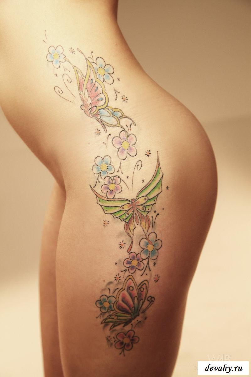 Очаровательная блондинка изящного сложения эротично оголяется в кадре, чтоб показать свою татуировку с бабочками на бедре. Миниатюрная барышня неспешно раздевается, показывая сначала свою бритую киску, затем маленькие аппетитные сиськи с возбужденными сосками. От пленительного очарования ее тела невозможно оторвать взгляд. Рисунок на теле начинается на бедре и переходит на талию, разноцветные бабочки могут упорхнуть в любой момент, как и сама их хозяйка, демонстрирующая свою гибкость становясь на мостик.