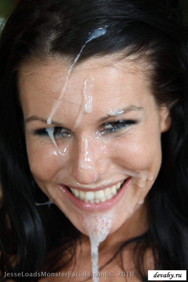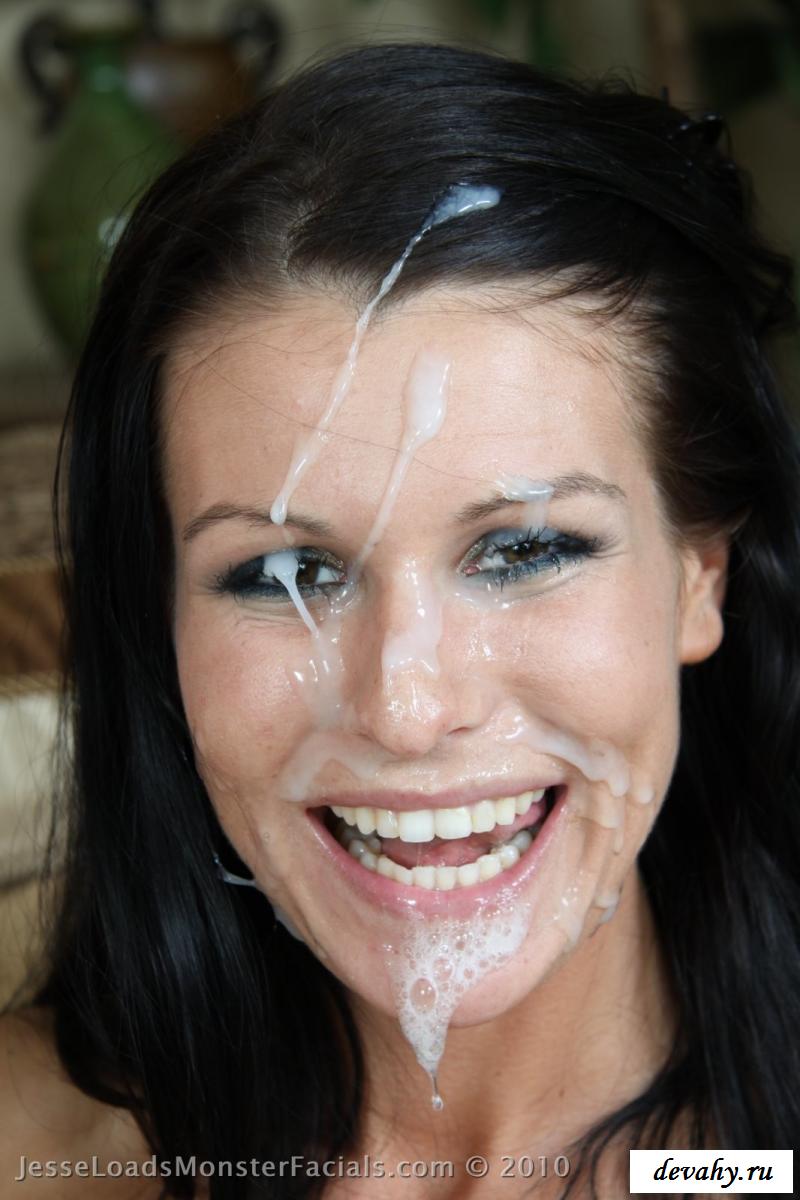 Лицо голой брюнетки с большими сиськами забрызгано спермой