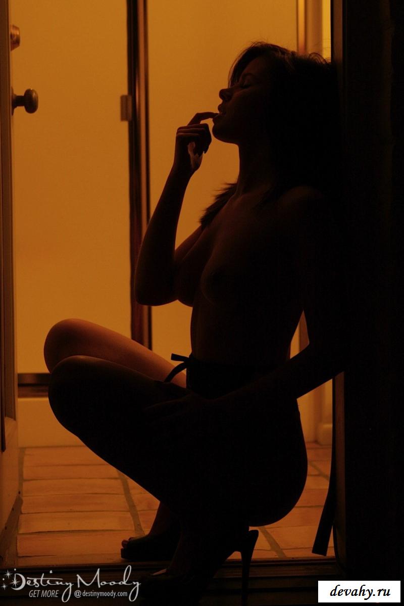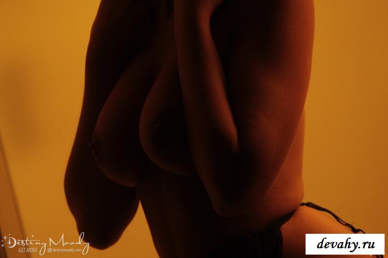 Брюнетка обладает шикарным телом, которое способно вызывать самые низменные эмоции в любом мужике. Уединившись дома, она устраивает настоящую эротику. Давалка вволю демонстрирует большую попу, идеально сочетающуюся с её сочными сиськами. Сняв лифчик, красотка принимает пикантные позы, стоя в дверном проёме душевой. Показав сисяндры, леди продолжительное время светит шикарной задницей, в которую хочется вцепиться обеими руками. От возбуждения, барышня покусывает, собственные трусики и думает о том, что надо бы воплотить свои сексуальные фантазии в жизнь с каким-нибудь парнем.
