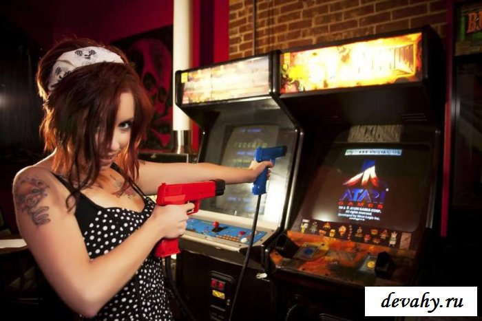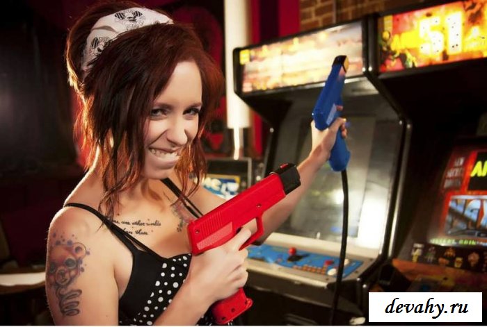 Иногда это поражает когда девка играет в мальчишеские игры, как наша сегодняшняя эмо гостья. Пока нет основного мальчишеского состава она с пистолетами проходит уровень за уровнем в игральном автомате, а самое примечательное, что делает это она в трусах и чулках, юбку уже где-то посеяла. Наигравшись отправится в бар, где полностью разденется и голой заберется на барную стойку прихватив с собой бутылку со спиртным. Для храбрости дернув горячая сучка покажет приличные сиськи и нормальную попку.