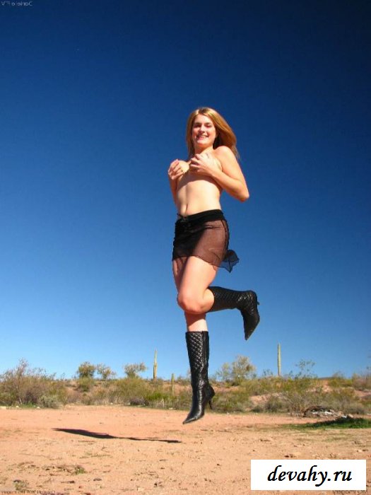 Девица с парнем предпочли экзотическое место для свидания - поле. Ясно светило солнышко и девке стало очень жарко, и она потихоньку начала скидывать вещи и дурачится с парнем. Обнаженная девица нашли башню с лестницей, на ней она и прыгала, задирала ножки. Вела себя раскрепощенно и свободно. Это было интересное представление, когда стройная сука с крупными сиськами, без трусов, себя ведет как девочка и прыгает как молоденькая козочка для получения шикарных эро фото.