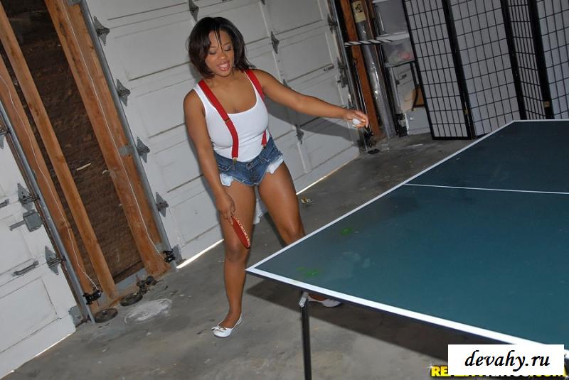 Молоденькая африканка, которая является только начинающей спортсменкой решила сыграть с профессионалом в этом деле на раздевание. Раздетая темнокожая во время этой игры будет всячески отвлекать внимание на свои интимные прелести, чтобы мужик проиграл ей. И теперь сможет ли эта сука с красивыми висячими грудями обыграть профессионала? И в конечном итоге она слила это состязание и после этого отправилась в ванную комнату, чтобы снять свою белую майку.