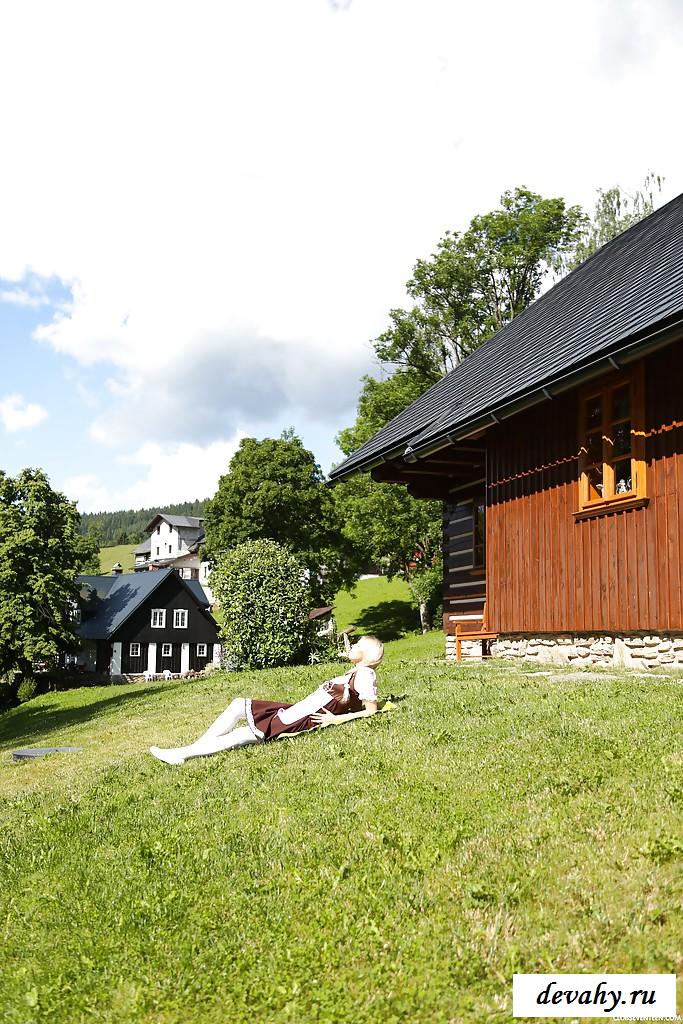 Привлекательная сельская жительница одета в униформу доярки, однажды после утренней дойки решила позагорать. Раздетая милая блондиночка отправилась за деревню. И теперь там сучка отдыхает на травке и оголяет различные части своего тела. И чтобы загар был как можно красивее, сучка решила побыть без трусов. И сначала она делала так, чтобы загар прилип на попку, а потом перевернулась, и ультрафиолетовые лучи начали подогревать ее пизду.
