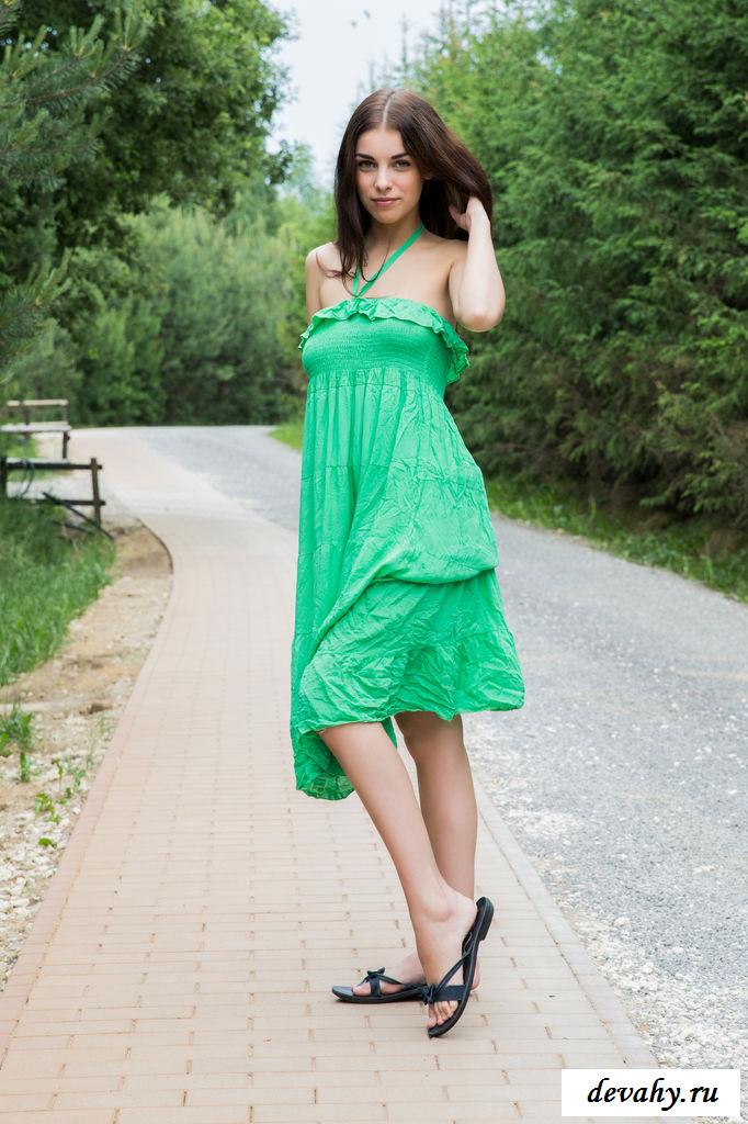 Прогуливаясь по парку в сексуальном вечернем платье зеленого цвета, сексуальная милашка захотела его немножко приподнять. И теперь обнаженная брюнетка решила раздвинуть ножки прямо в общественном месте и стала расслабляться. Для демонстрации своих интимных мест и ножек без трусов развратница присела на разогретую солнцем плитку и стала постепенно поднимать длинное вечернее платье. Оголив задок, Катя отодвинула рукой ягодицу, чтобы притронуться руками к анусу.