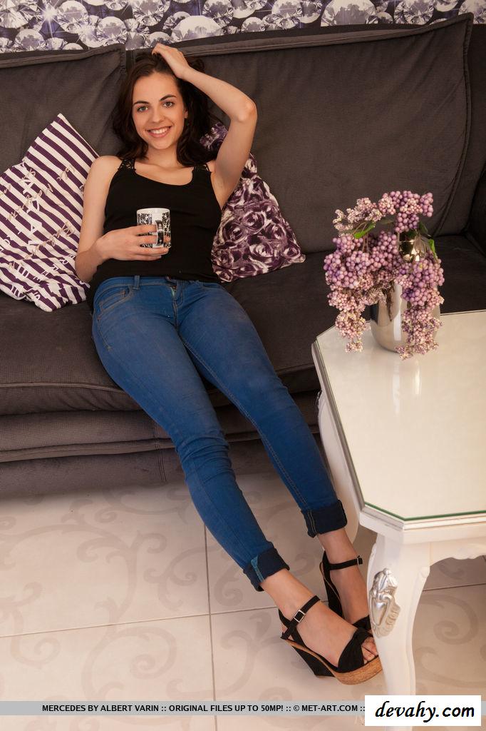 Сексуальная улыбчивая латышка по имени Andrea Mercedes решила показать, как превосходно ее хрупкое молоденькое тельце смотрится без одежды. И вот теперь развратница эротично сняла с себя джинсы и стала возбуждать себя. И как оказалось, что под штанами эта молоденькая брюнетка не носит нижнего белья, что добавило ей еще больше сексуальности. Но много кайфа молодуха получила от того, что уже, будучи без одежды она раздвинула свои тонкие ножки.