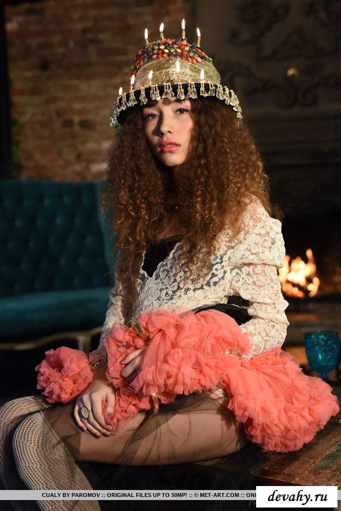 Обнаженная кудрявая девица, любительница светских тусовок любит появляться на публике в необычных сексуальных нарядах. И вот сегодня эта леди будет позировать в шляпе со свечами, что очень опасно, учитывая то, что ее волосы в любой момент могут вспыхнуть. Сняв с себя этот головной убор, сучка решила избавиться и от остальной одежды, чтобы как можно скорее показать свои титьки первого размера. И когда ее тело было полностью голым, она направилась на тигровое покрывало.