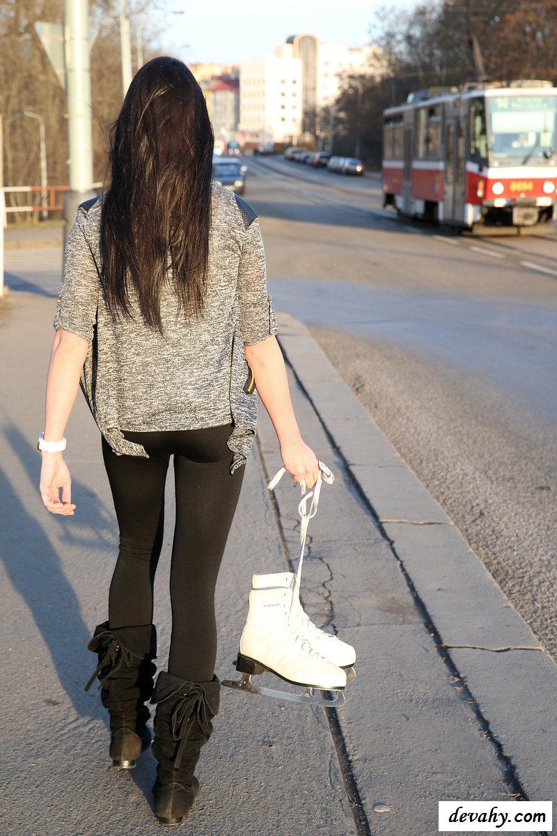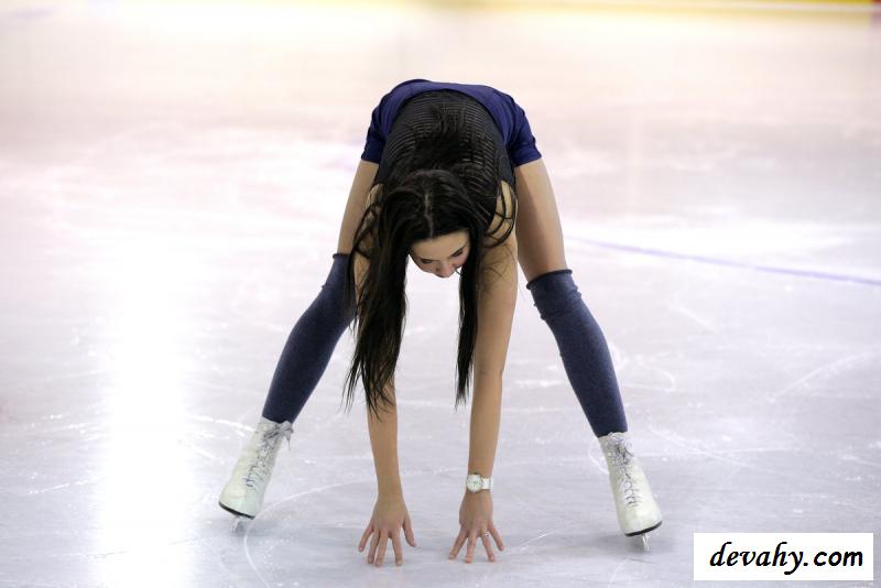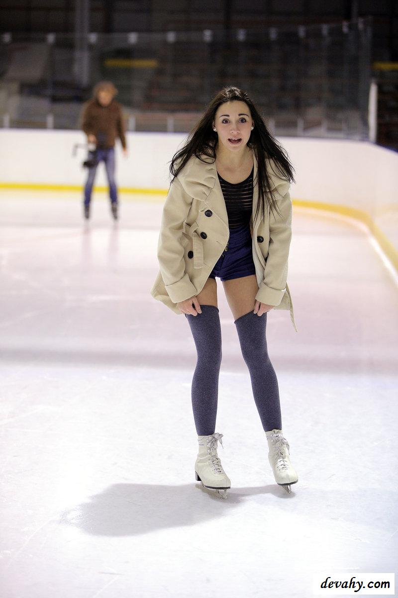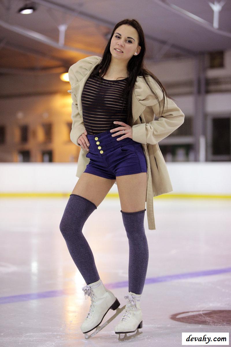 Похотливая брюнетка очень часто предпочитает устраивать эротику и показывать всем, какой она является похотливой сучкой, когда тренируется на коньках. И вот однажды сучка после катания на льду отправилась в раздевалку прямо на своих белых коньках и там стала широко раздвигать тонкие ножки и раскрывать половые губки, чтобы их увидели остальные фигуристки, которые очень завидуют этой девушке во всем.