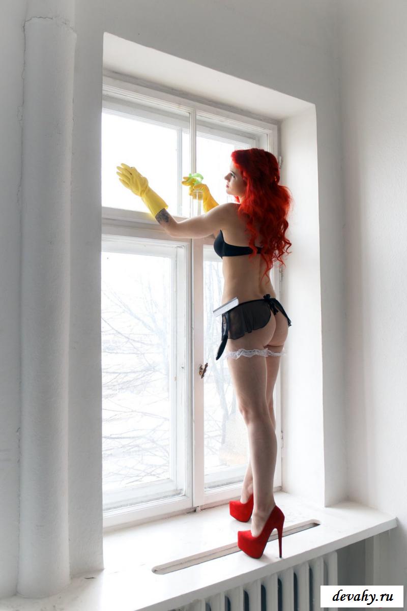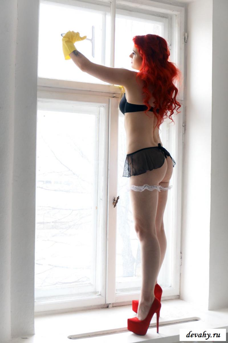 Очаровательная рыжая телочка с очень длинными стройными ногами танцует страстно на подоконнике, отмывая окна в жаркий день и поднимая настроение у случайных свидетелей. Милая сучка с обнаженной писькой не стала стесняться порочных желаний и долго игралась с маленьким клитором, пытаясь пописать от экстаза в баночку. Сексапильная и очень игривая студентка с ярко рыжими волосами на голове может и незнакомцам приносить в жизнь одни наслаждения и экстаз.