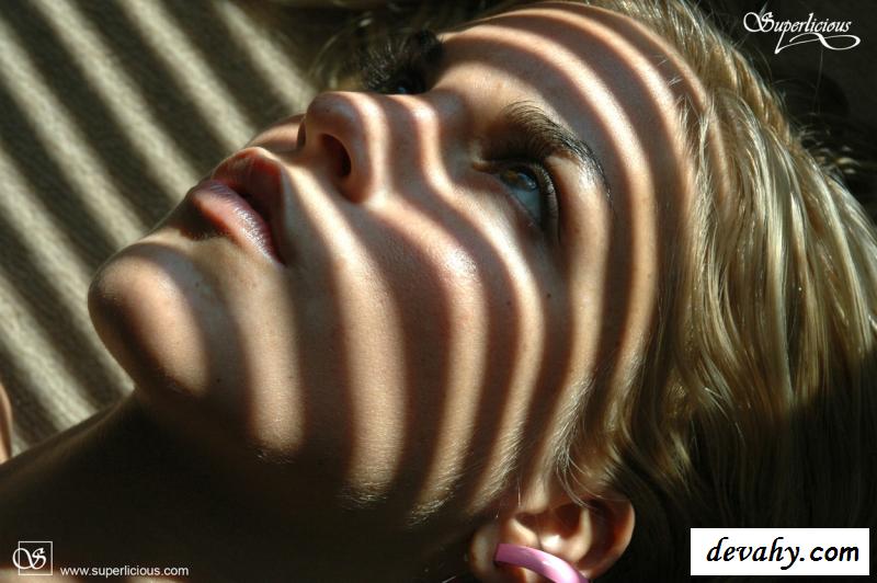 Лежа на полу обнаженная блондинка встречает рассвет