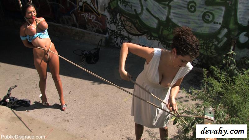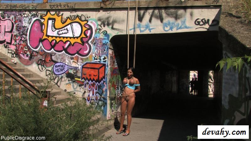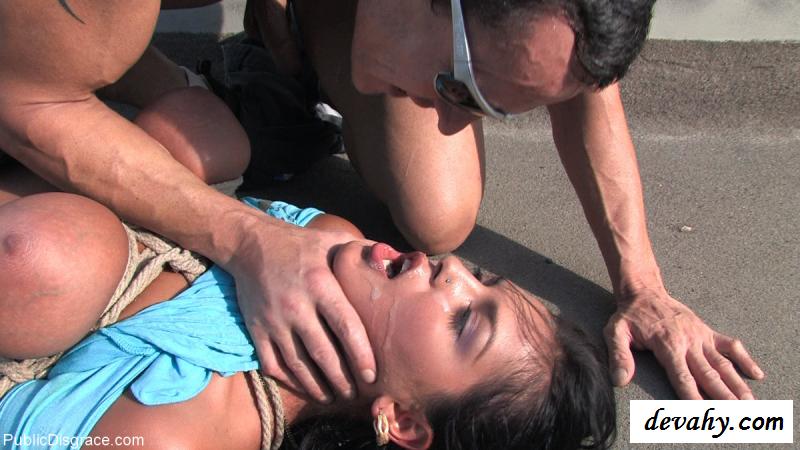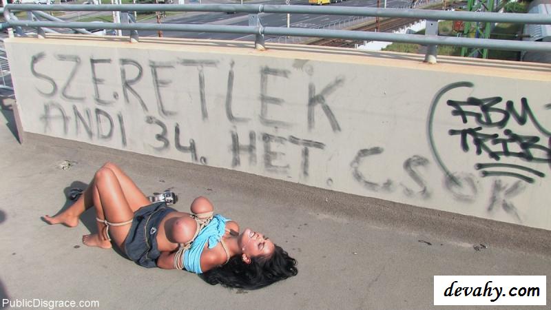 Голая связанная румынка с огромными титьками любит разное унижение и ее возбуждает то, как ее связывают мужчины. Сегодня одна влюбленная парочка решила трахнуть эту брюнетку прямо на улице, удовлетворив все ее желание. И вот теперь на публике они связали девицу, поднесли к ее пизде вибратор и стали шлепать ее. Затем к ней подошел мужик и воткнул ей в рот стоячий обрезанный пенис. А когда пришла пора кончать, он уложил красотку прямо на асфальт и начал сливать сперму в ее широко раскрытый рот.