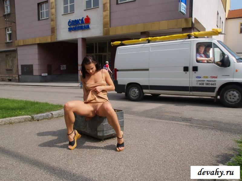 Изумительная девушка на улице сексуально позирует, без всякого стеснения подставляя перед объективом фотокамеры своё очаровательное тело. Малышка настолько соблазнительно задирает платье, что все молниеносно могут насладиться её божественными обнажёнными титьками, а также обворожительными раздетыми гениталиями. Конечно, незнакомцы остались в полнейшем восторге от блистательной малышки, которая встретилась случайно на их пути, сверкая клёвым голым телом.