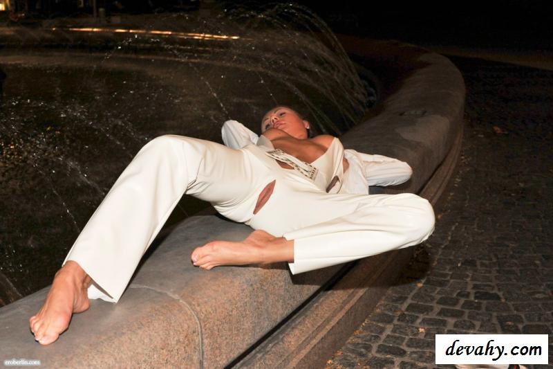 Раздетая путана во время прогулки по набережной решила подойти к фонтану и уже там стало видно, что на ее штанах имеется вырез в районе пизды и на данный момент она без трусов. И вот теперь телочка в белом костюме решила продемонстрировать всю свою сексуальность ночью и присела рядом с водой, раздвинув предварительно тонкие ножки. При этом она также раскрыла свои шикарные стоячие груди, чтобы смотреться еще сексуальнее в образе настоящей шлюхи.