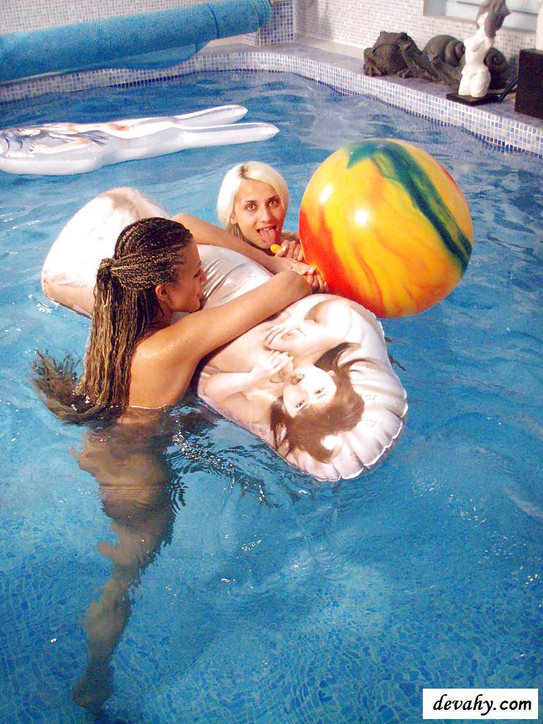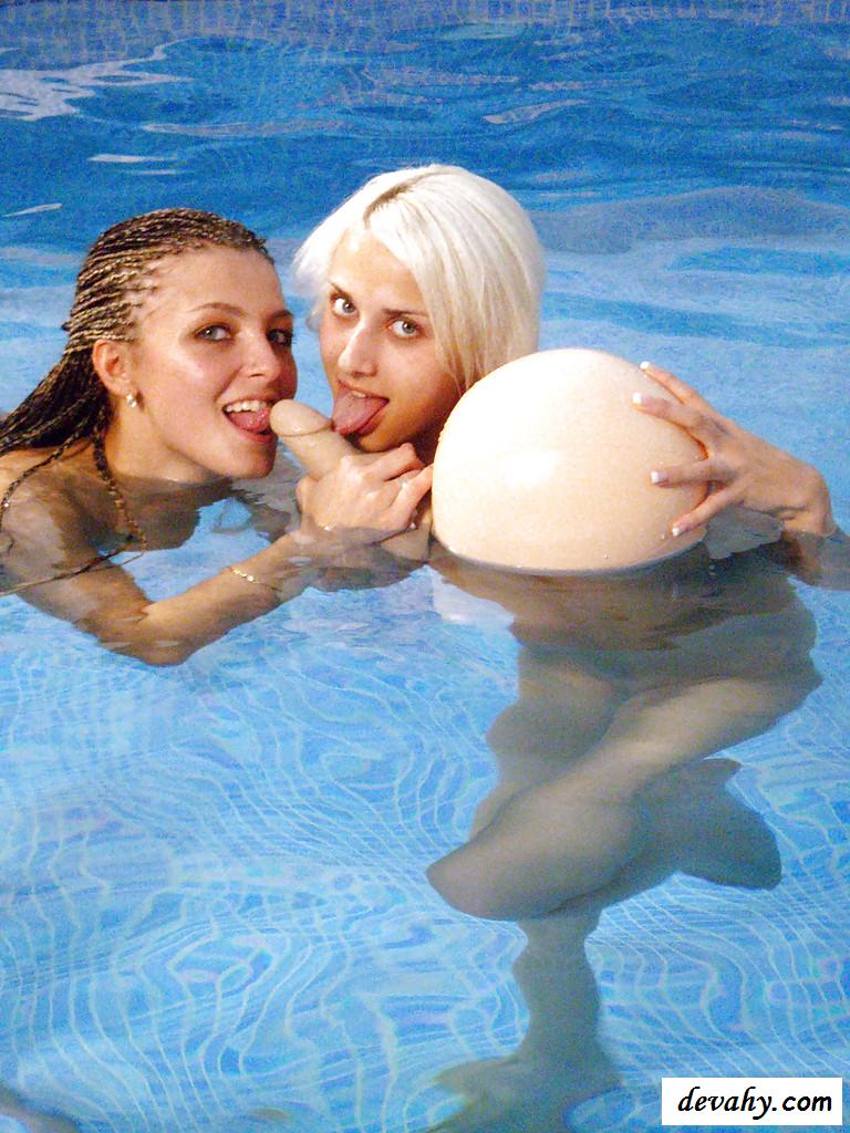 Голые девицы предпочитают себя очень развратно вести под водой и плавать без купальников. И вот теперь они развлекаются в бассейне с надувной игрушкой в виде настоящего мужика, у которой имеется огромный член. Потрогав этот резиновый пенис, им удалось возбудиться и после этого они нырнули глубоко в воду, чтобы насладиться оральными ласками, а оператор снимал их приключения с необычных ракурсов. От таких невероятных ласк им быстро удалось испытать оргазм.