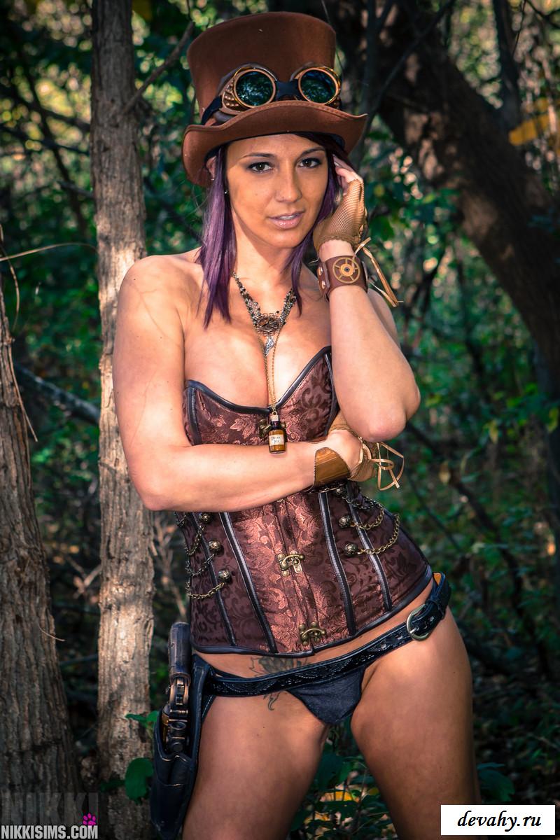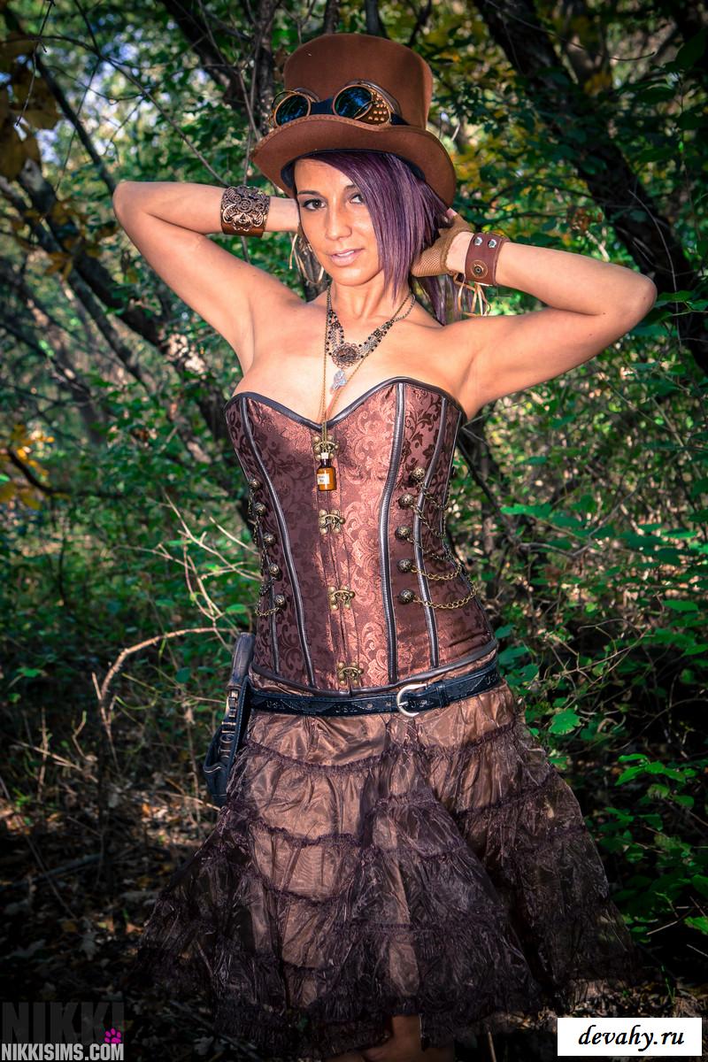 Во время фотосессии в старинном стиле голая модель даже и не планировала очень сильно оголяться и показывать различные части своего тела. Но в конечном итоге эта развратница в лесу продемонстрировала свои сиськи, которые изначально прикрывала руками, чтобы не были видны ее отличные соски. В конечном итоге она так и не решилась снимать с себя свои тонкие стринги, но зато показала превосходные ягодицы, которые просто замечательно смотрелись в кадре.