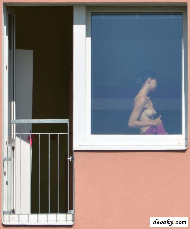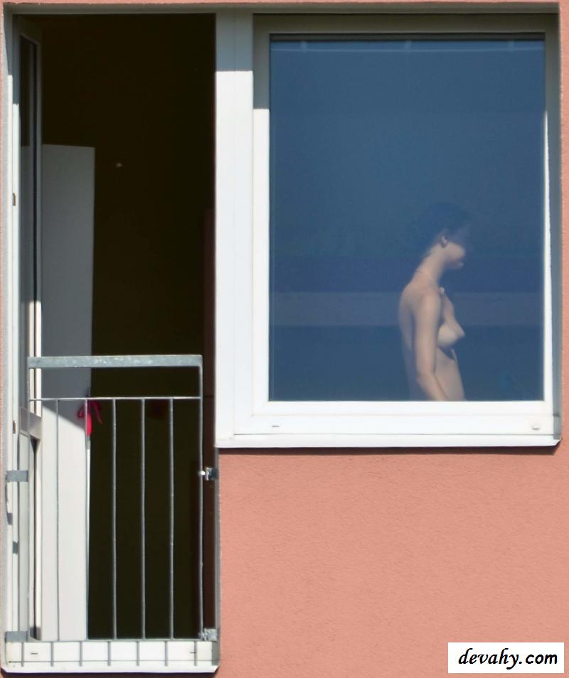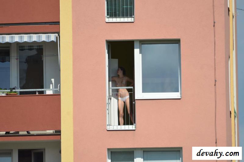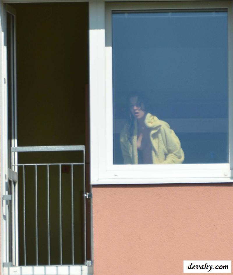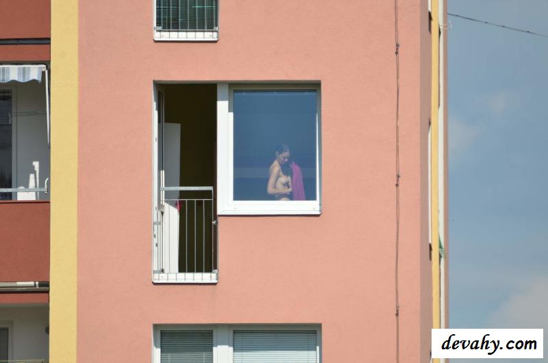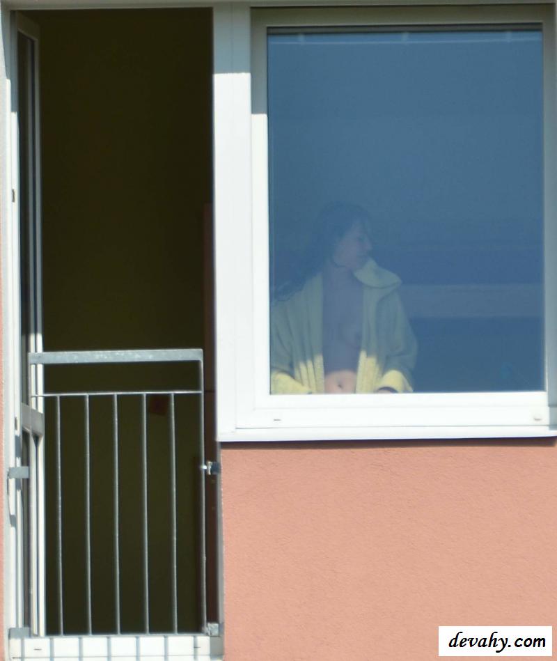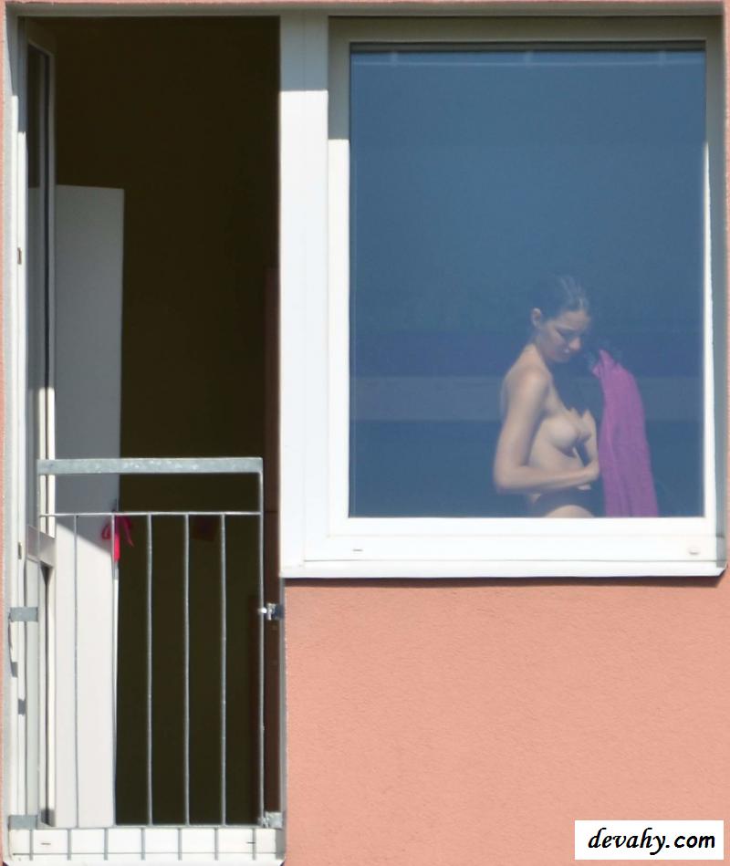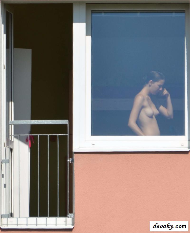 Молодуха с сексуальным тонким телом не собирается вешать шторы в окне своей квартиры, поскольку, таким образом, она соблазняет всех соседских мужиков. И для этой цели девица ходит эротично по всему жилищу без нижнего белья. Особенно практически на всех снимках видны ее небольшие титьки, которые она даже не скрывает, когда возвращается домой и расстегивает пальто. В целом девице даже нравится, что за ней следят возбужденные мужики, ведь она даже сама от этого заводится.
