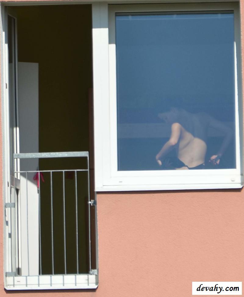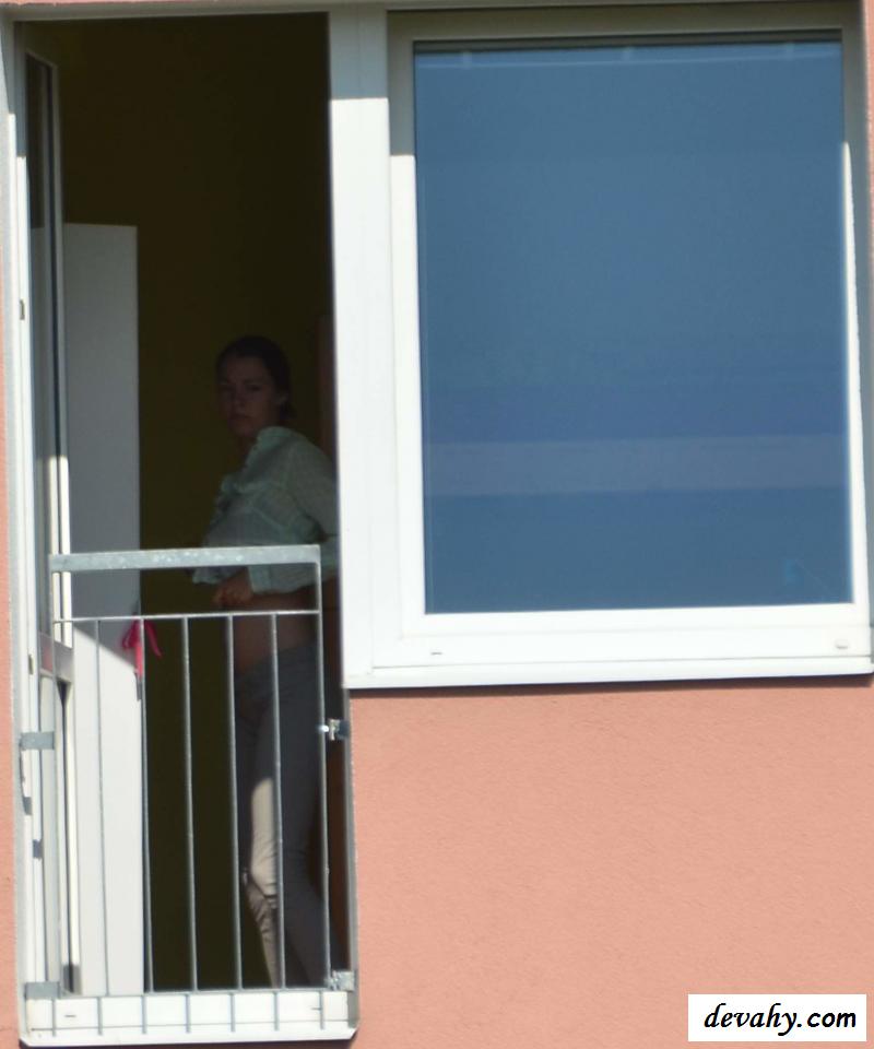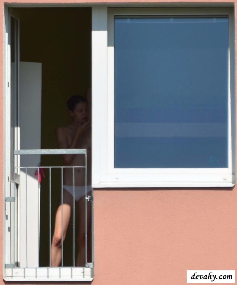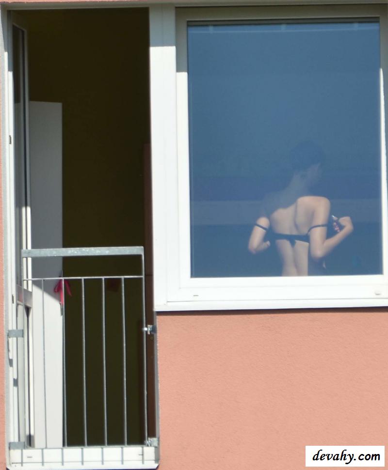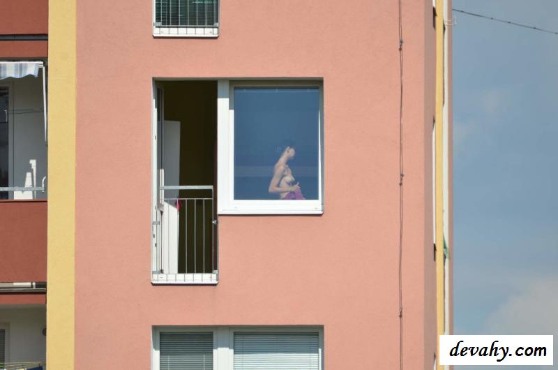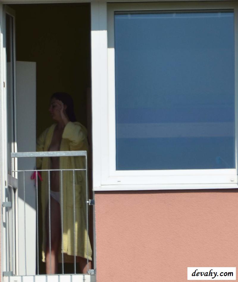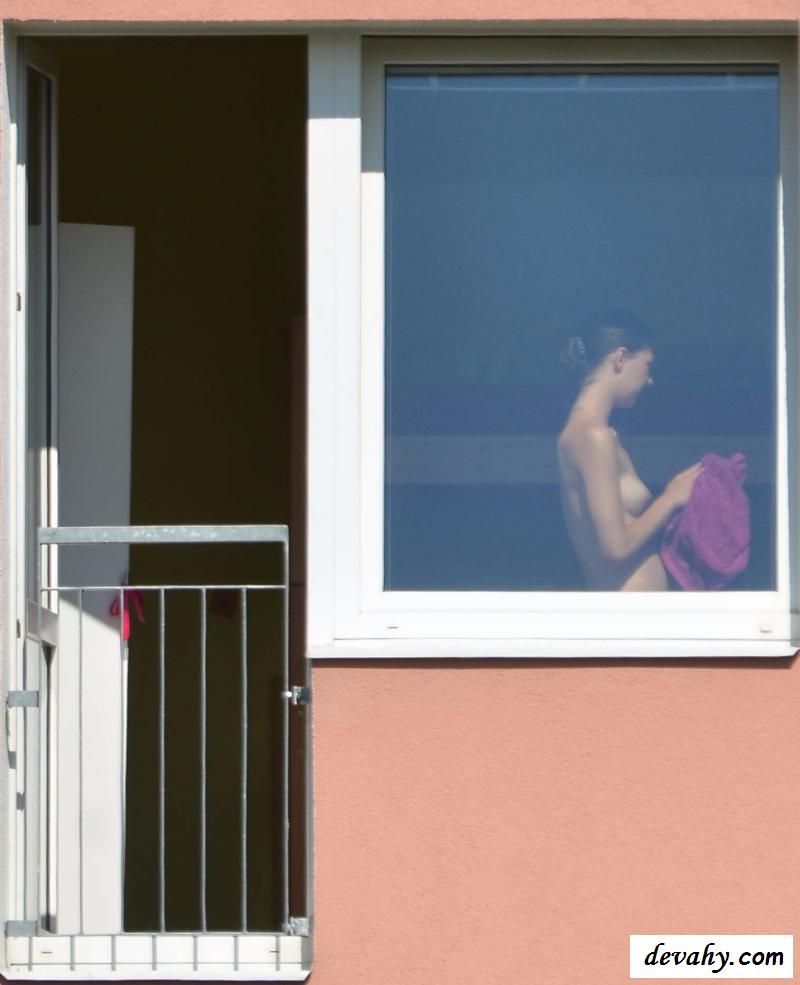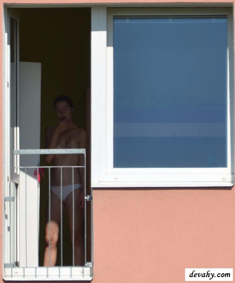 Молодуха с сексуальным тонким телом не собирается вешать шторы в окне своей квартиры, поскольку, таким образом, она соблазняет всех соседских мужиков. И для этой цели девица ходит эротично по всему жилищу без нижнего белья. Особенно практически на всех снимках видны ее небольшие титьки, которые она даже не скрывает, когда возвращается домой и расстегивает пальто. В целом девице даже нравится, что за ней следят возбужденные мужики, ведь она даже сама от этого заводится.