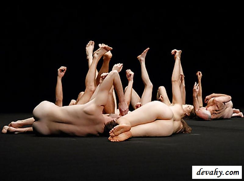 Обнаженные актеры порой во время своих спектаклей не стесняются даже раздеваться перед публикой, чтобы заработать в ее глазах популярность. Сегодня мы увидим, как на сцене большого театра некоторые люди начинают вести себя развратно. Это наблюдается с самых первых фотографиях, где мужчины и женщины лежат на влажном полу и при этом трогают друг друга, раскрывая гениталии и остальные части своих тел. На одном из снимков также видны девицы, которые присели на колени и стали демонстрировать нежные киски.