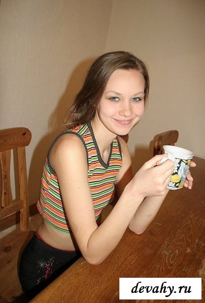 Девочке только стукнуло 18 лет, как она сразу почувствовала себя взрослой и приняла участие в эротической съемке. Сначала она сидит и пьет чай, а потом бросив заниматься ерундой, начала раздеваться, молодость это хорошо, особенно когда есть такая аккуратная киска, сиськи еще, правда не выросли.