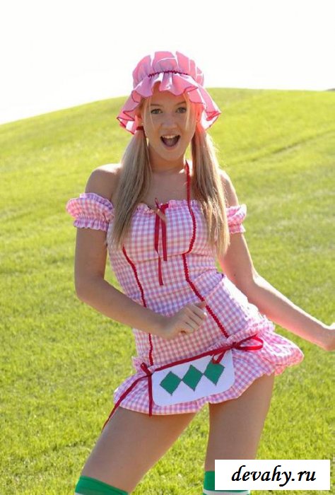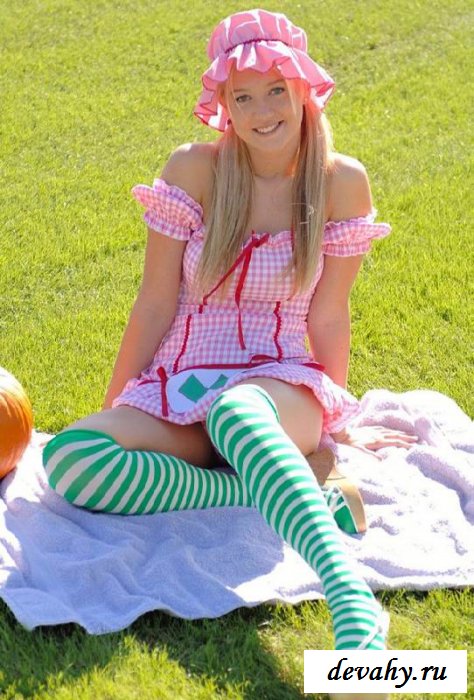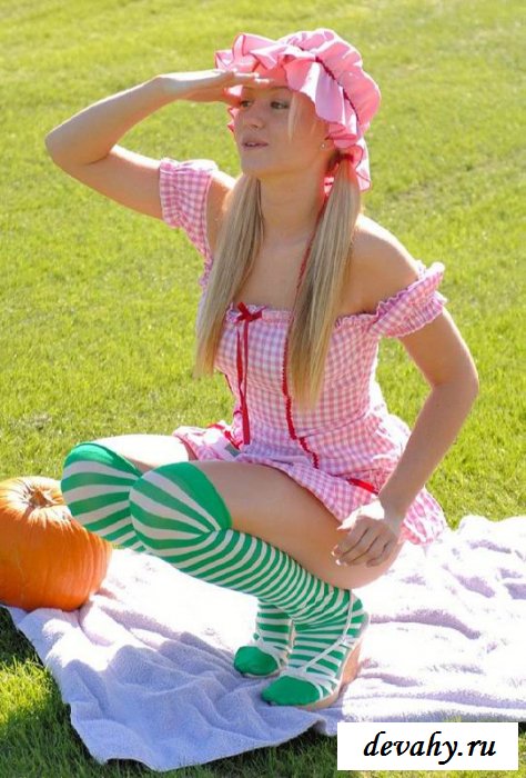 Эта практически обнаженная красная шапочка - милая светловолосая девушка с крупными сиськами позирует в парке. Не такая она и красная скажете, но здесь не все просто так. У настоящей шапки черные волосы были, а наша внучка – естественная блондинка, и как все реальные блонды она розовый цвет обожает, вот и платье нее такого цвета. Ей восемнадцать и она даже опасалась заходить в лес, а вдруг съест серый волк. Вот парке свободно скинула лишнее позволяя сделать сексуальные снимки ее шикарной киски.