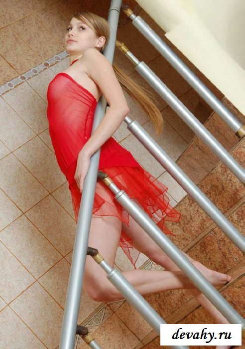 Перед вами молодая девица на лестнице своего дома в одном лишь парео, показывающая красоту тела в самых заманчивых позах. Под красным нарядом у эротичной особы скрываются изумительные груди с топорщащимися сосками, и влажная пизда с симпатичным внешним видом. Лестница это замечательное место, где как ни стань открываются замечательные виды, тем более трусов нет. Деваха с радостью обнажит изумительные груди для всех, а увлажненная пизда с небольшим пушком только добавит эротизма