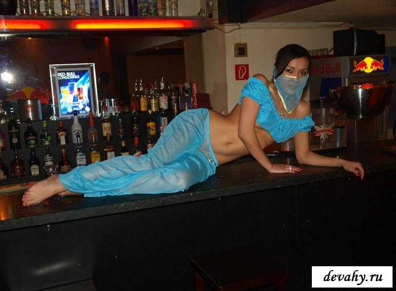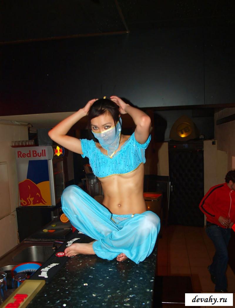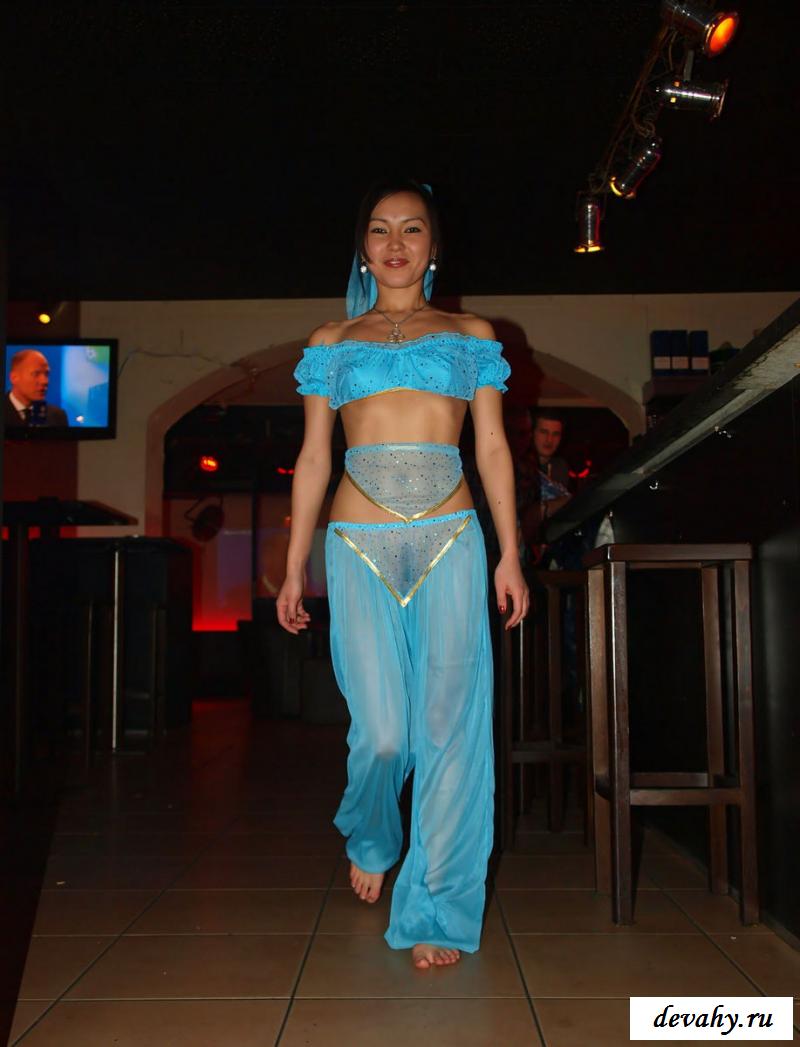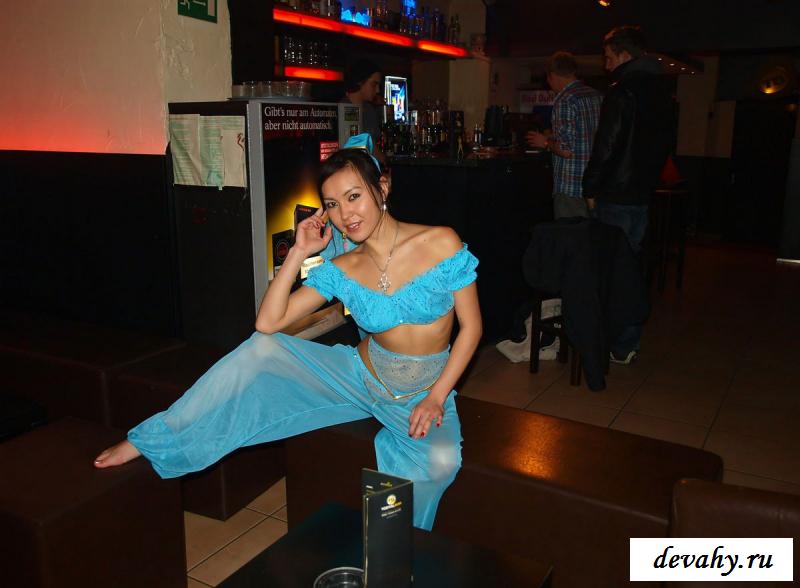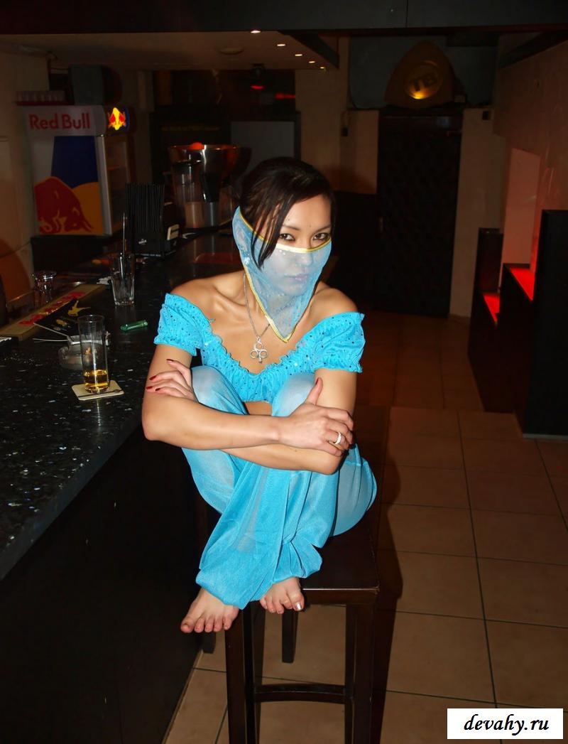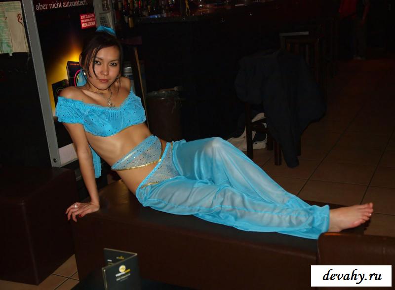 Молоденькая бурятка с милой внешностью решила удивить своих друзей и пришла в ночной клуб в прозрачных голубых штанах, через них была видна ее киска. Посидев немного у барной стойки, эта развратница и вовсе оголилась и стала, показывают шикарную обнаженную пизду, которая отлично смотрелась в различных ракурсах. Помимо влагалища она также стала демонстрировать и небольшие сиськи, которые в то же время смотрелись превосходно.