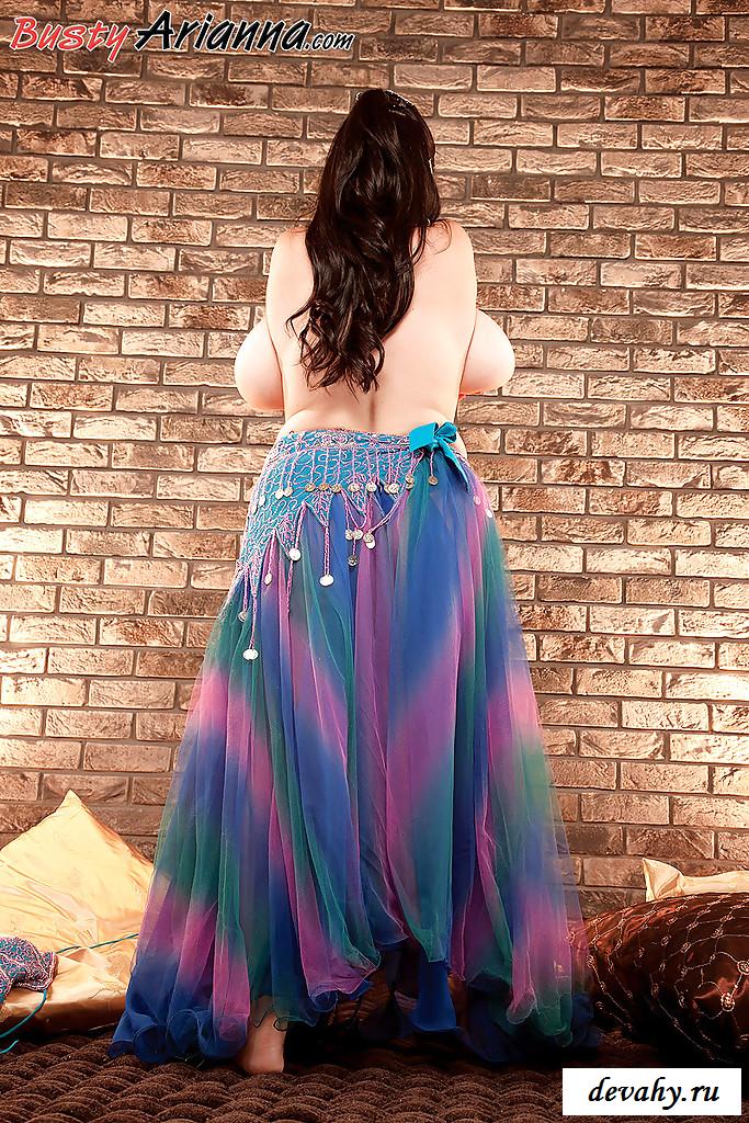 Молодая танцовщица цыганской национальности решила после выступления продемонстрировать весь свой молокозавод, который сексуально трусился во время исполнения номера. Обнаженная цыганка отправилась в комнату с необычным декоративным оформлением и прямо там достала свое вымя и начала перекладывать его из руки в руку. Затем брюнетка с очень пышными дойками крепко сжала их руками, что ее сильно возбудило, и отодвинула синие трусики от влажненькой пизды.