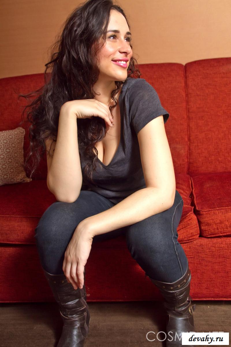Молодая кудрявая брюнетка однажды приехала в квартиру своего друга и решила соблазнить парня, который влюбился в нее по уши. И теперь милашка эротично светит своими сосками перед ним и сексуально раздевается на его красненьком диванчике. Сначала сучка стянула с себя кофточку, а затем джинсы, после чего спустила немного лифчик и вывалила пухленькие сосочки. Также через ее прозрачные нейлоновые колготки была видна пизда, поскольку телочка не носит нижнего белья, как и многие девчата.