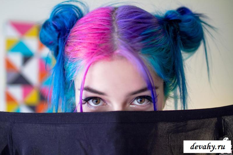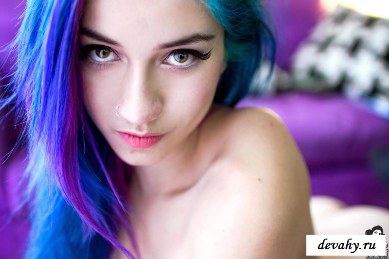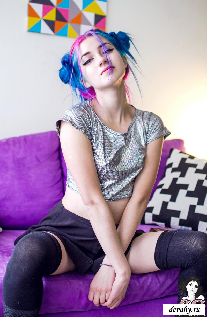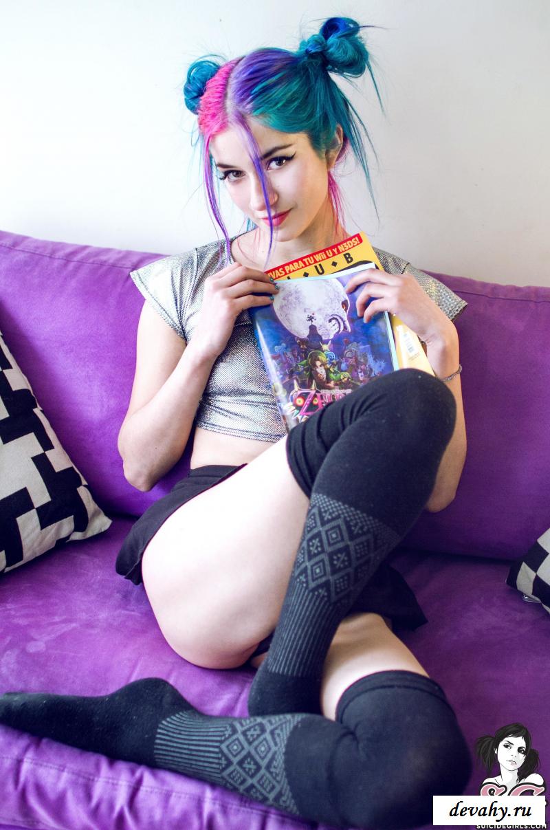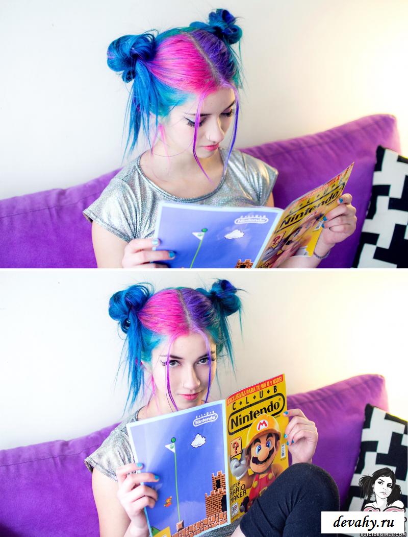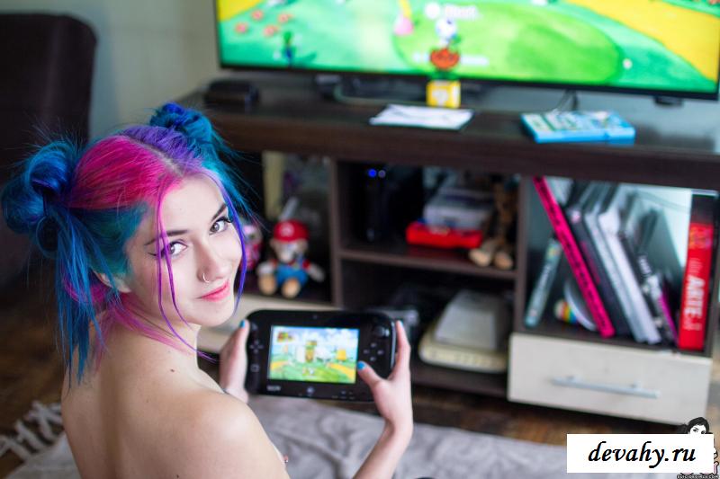 Милая девушка неформальной внешности очень любит проводить время за видеоиграми. Однако еще, игрунья всегда рада попозировать, чтобы засветить свою голую фигурку. Красотка отличается от обычных девушек: сине-фиолетовые волосы, пирсинг в сосочках и не типичное для тёлочек увлечения приставками. Всё это делает из барышни настоящую мечту всех парней, ведь эта сочная мадам прекрасно понимает их увлечения. С первого же кадра геймерша демонстрирует потрясающую попу. Задница выглядит и правда чудесно, особенно, в контрасте со стройной талией. Мило закрыв киску приставкой, барышня сидит на диване и поглаживает груди. Также, красотка одевает весьма эротический наряд и читает журнал про игрушки, не забывая вставать раком. Таких красавиц мало и все они – на вес золота.