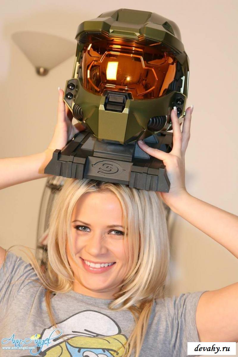 Красивая девушка проводит время, играя в приставку. Блондинка совсем недавно приобрела новый джойстик, и он необыкновенно ей понравился. Это вдохновило леди снять футболку и показать голые сиськи. Перед этим, сучка избавляется также от шортиков, продемонстрировав круглую попку в стрингах. Развратница то и дело примеряется к джойстику, возбужденно прикасаясь к нему промежностью. А в какой-то момент красотка настолько возбуждается, что, наконец, обнажает грудь. Длинные волосы очень сексуально падают на её талию, а геймерша сидит в очень страстной позе и расставляет ножки, очаровывая манящими буферами.