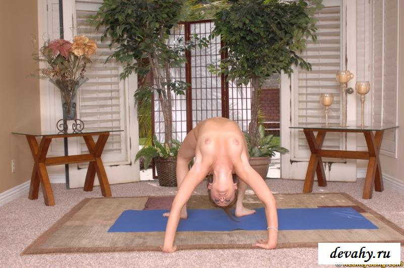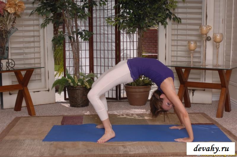 Развратная девица решила заняться йогой в своих обтягивающих лосинах. Одев их, обнаженная спортсменка направилась в самую большую комнату своего дома. И когда гибкая начала выгибать все свое тело, ей стало неудобно и сучка захотела избавиться от такой одежды. И без нее она сможет демонстрировать свою гибкость еще лучше. Выполняя такие упражнения без одежды, телочка очень сильно возбудилась и теперь она не может остановиться.