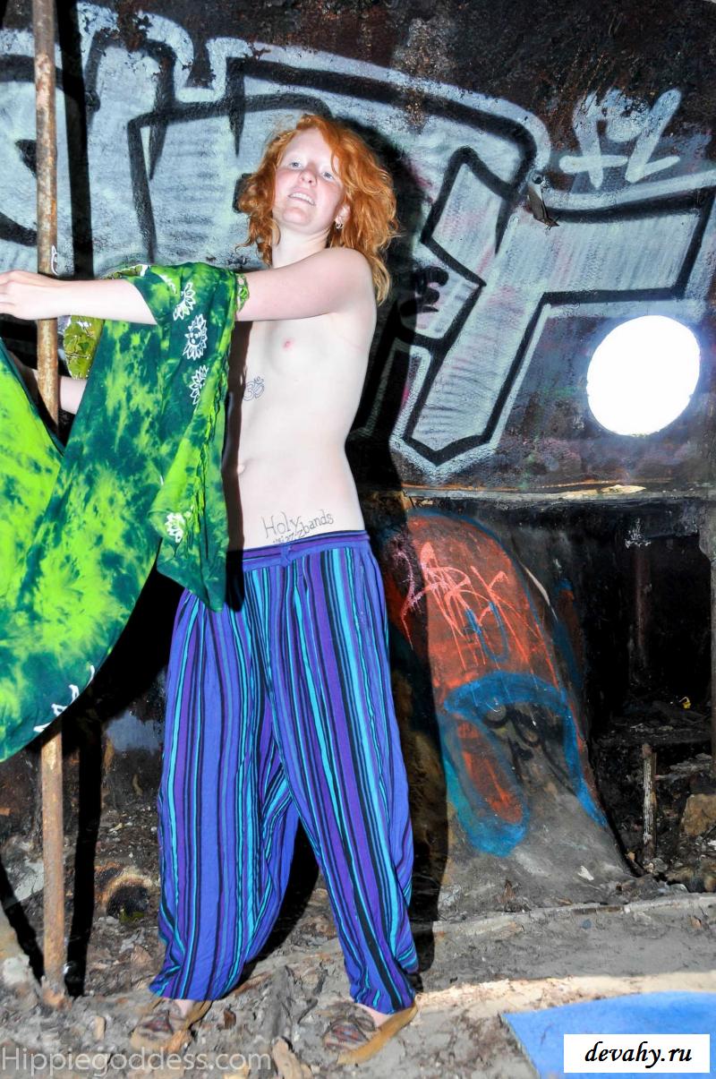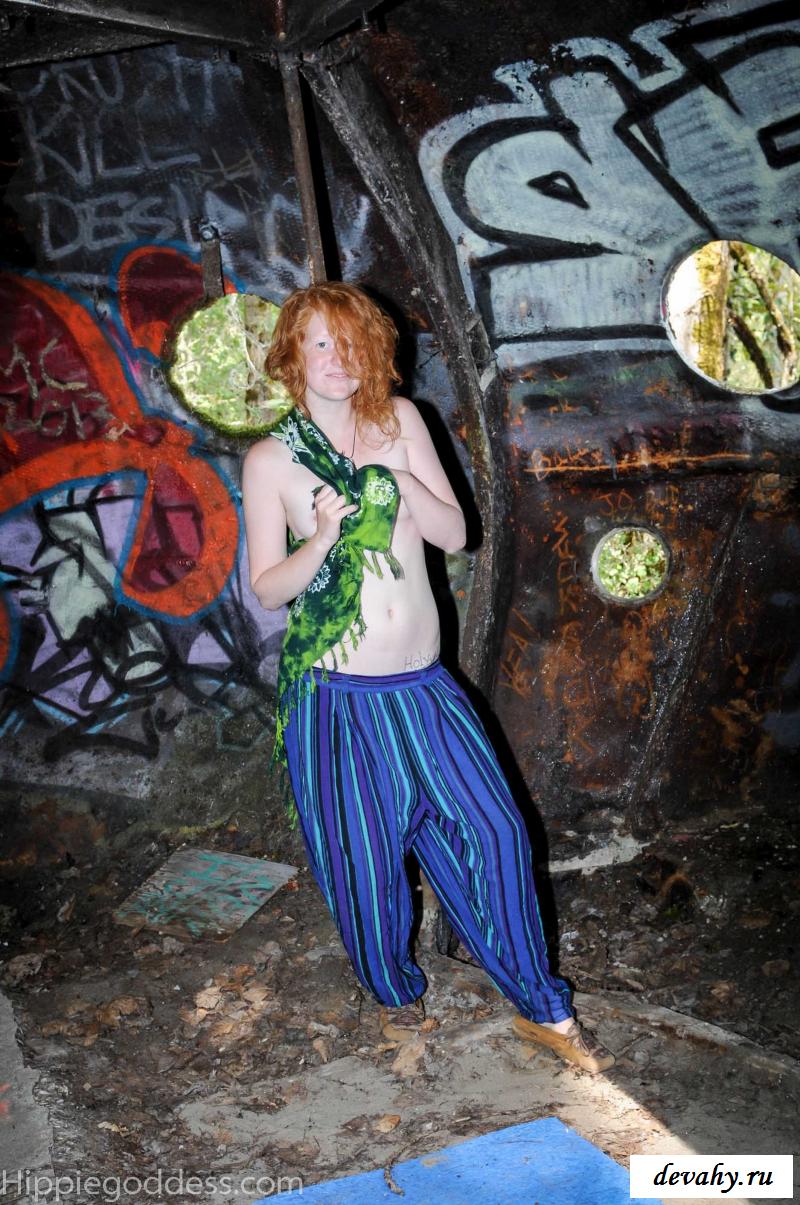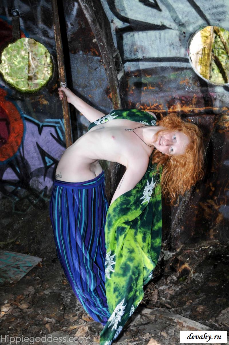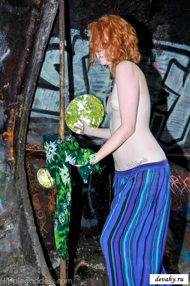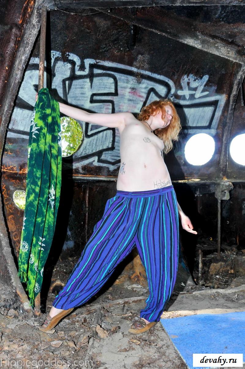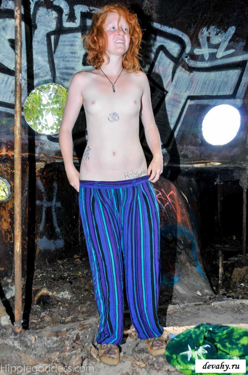 Привлекательная рыжеволосая хиппи, однажды нашла за городом старый разваленный дом с круглыми иллюминаторами и прямо там начала демонстрировать свои оголенные мелкие титьки. Это раздетой сучке сильно понравилось и она даже стала танцевать, слегка прикрыв верх своего тела разноцветным платком. Во время исполнения танца она также сняла свои широкие штаны, под которыми не было трусиков и скрывалась ее небритая молодая пизда.