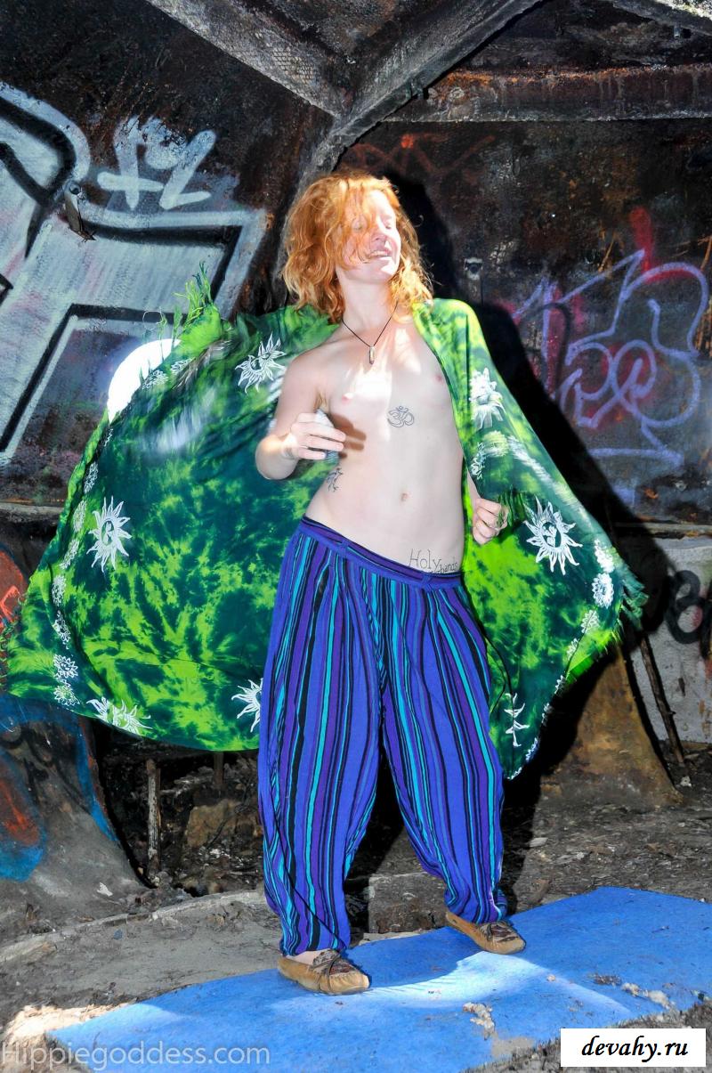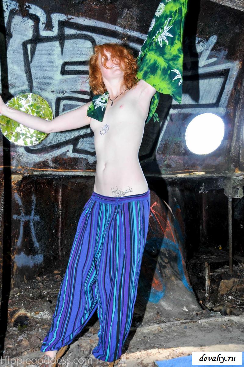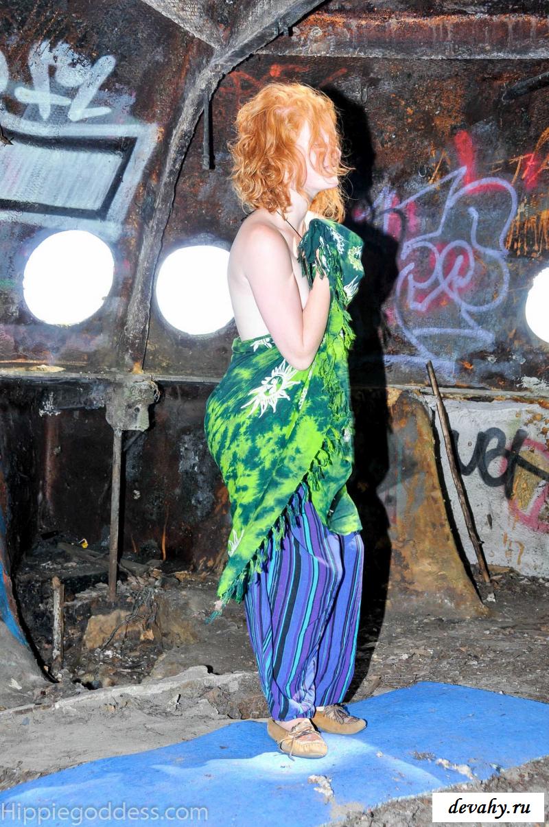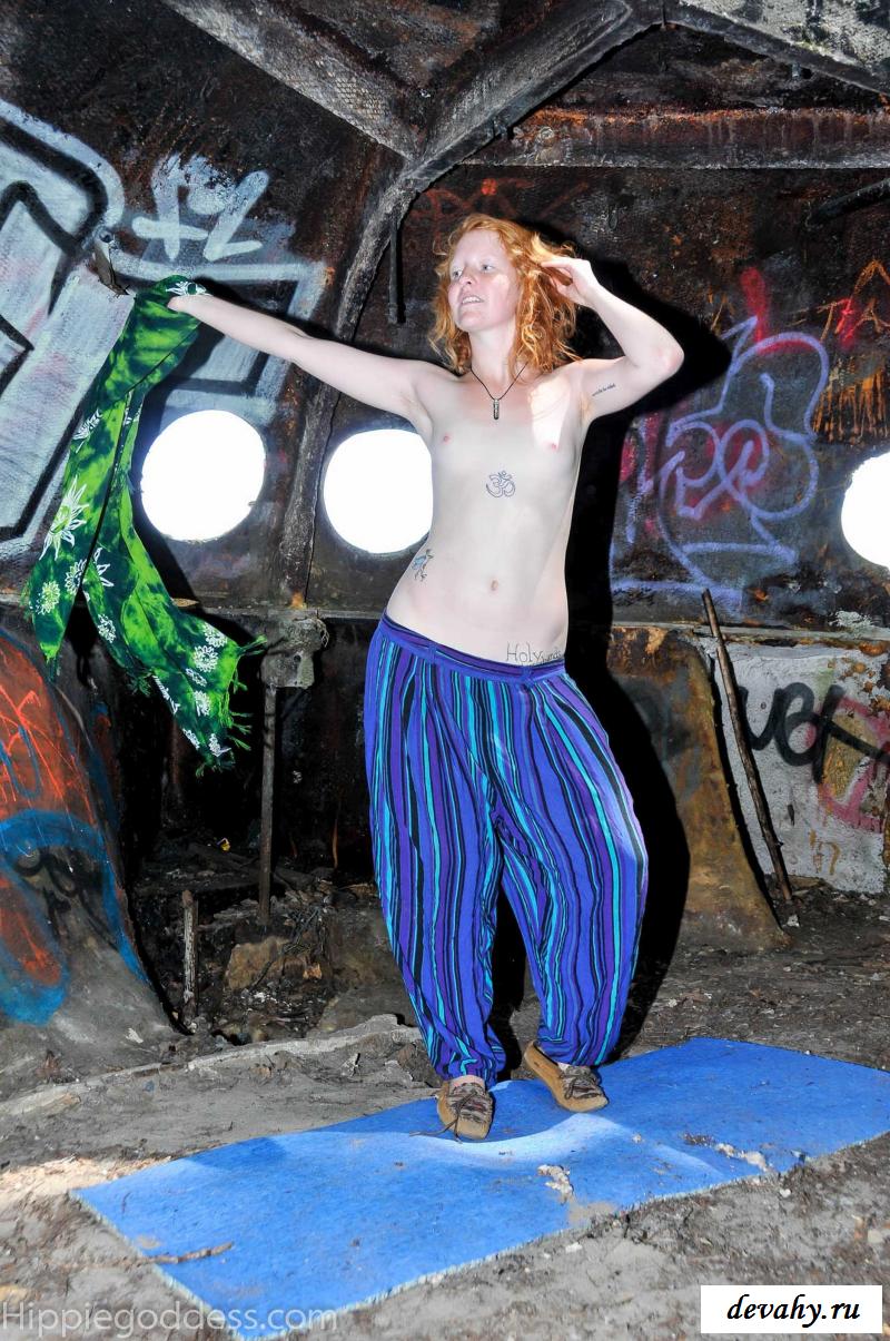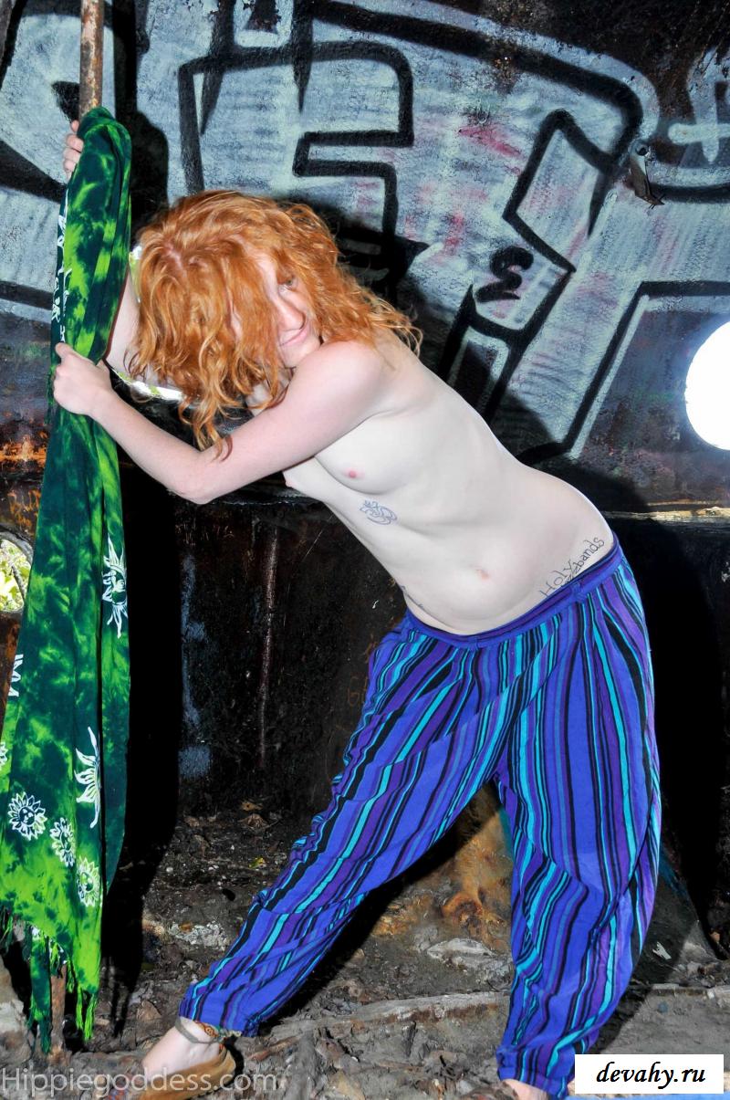 Привлекательная рыжеволосая хиппи, однажды нашла за городом старый разваленный дом с круглыми иллюминаторами и прямо там начала демонстрировать свои оголенные мелкие титьки. Это раздетой сучке сильно понравилось и она даже стала танцевать, слегка прикрыв верх своего тела разноцветным платком. Во время исполнения танца она также сняла свои широкие штаны, под которыми не было трусиков и скрывалась ее небритая молодая пизда.