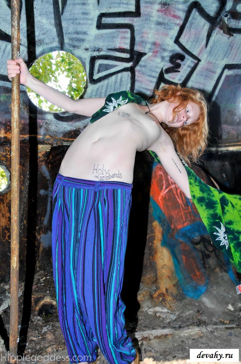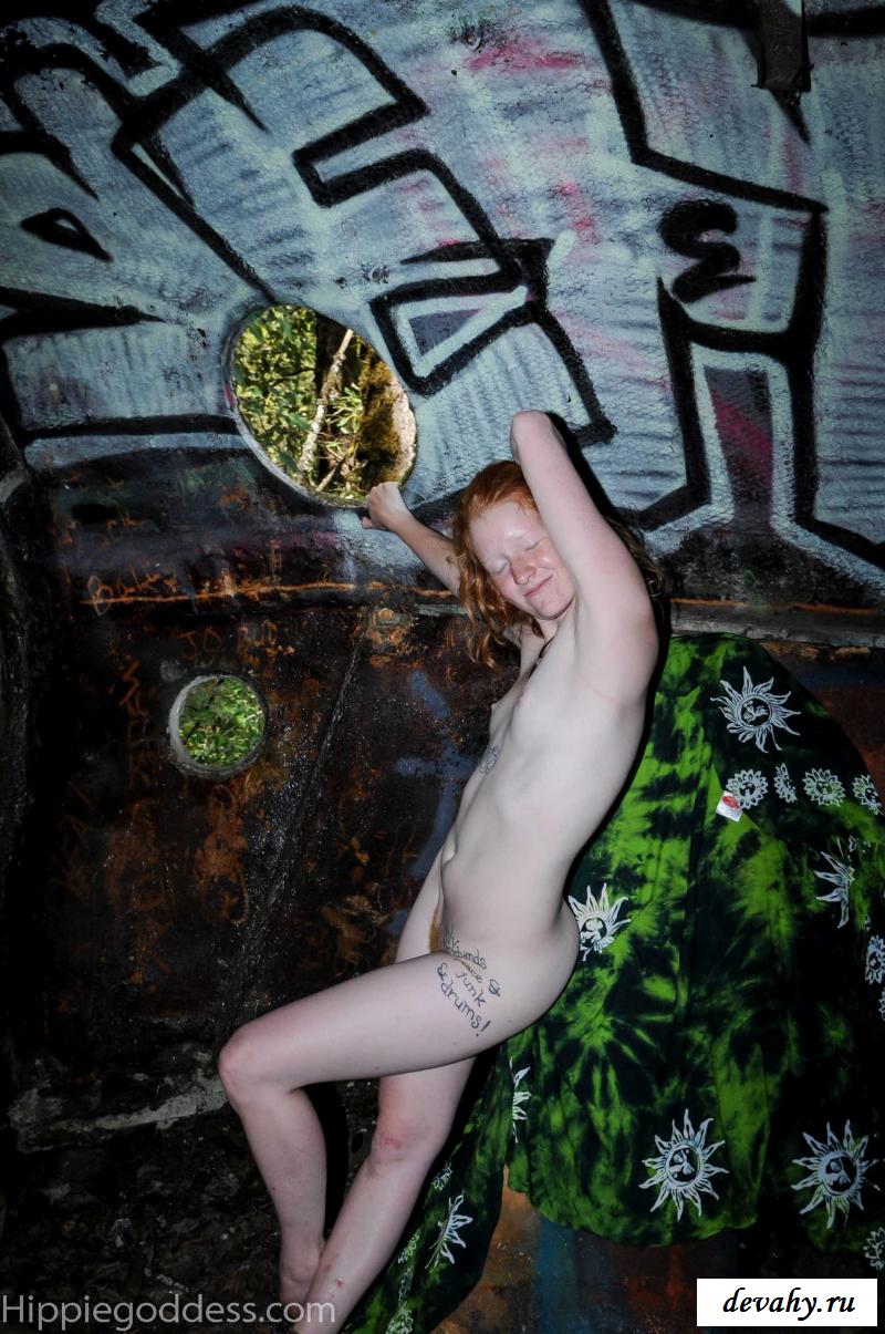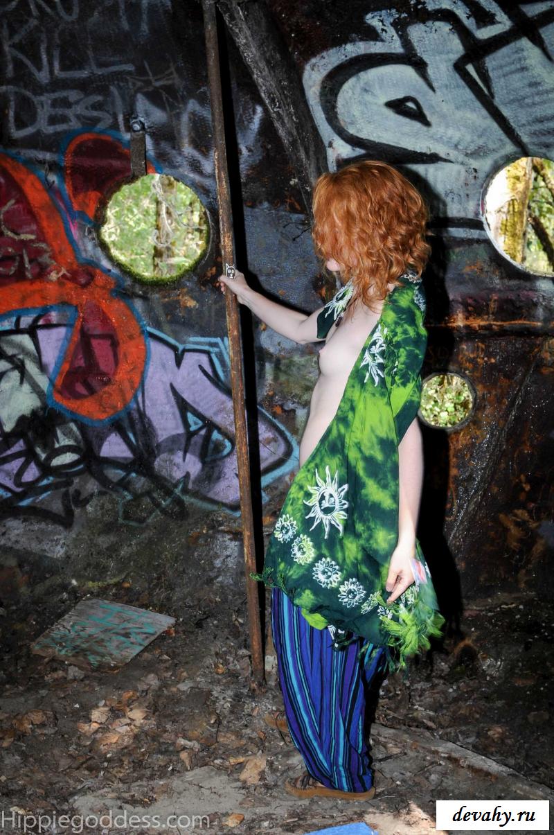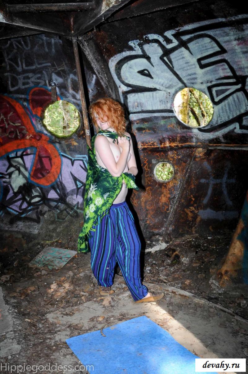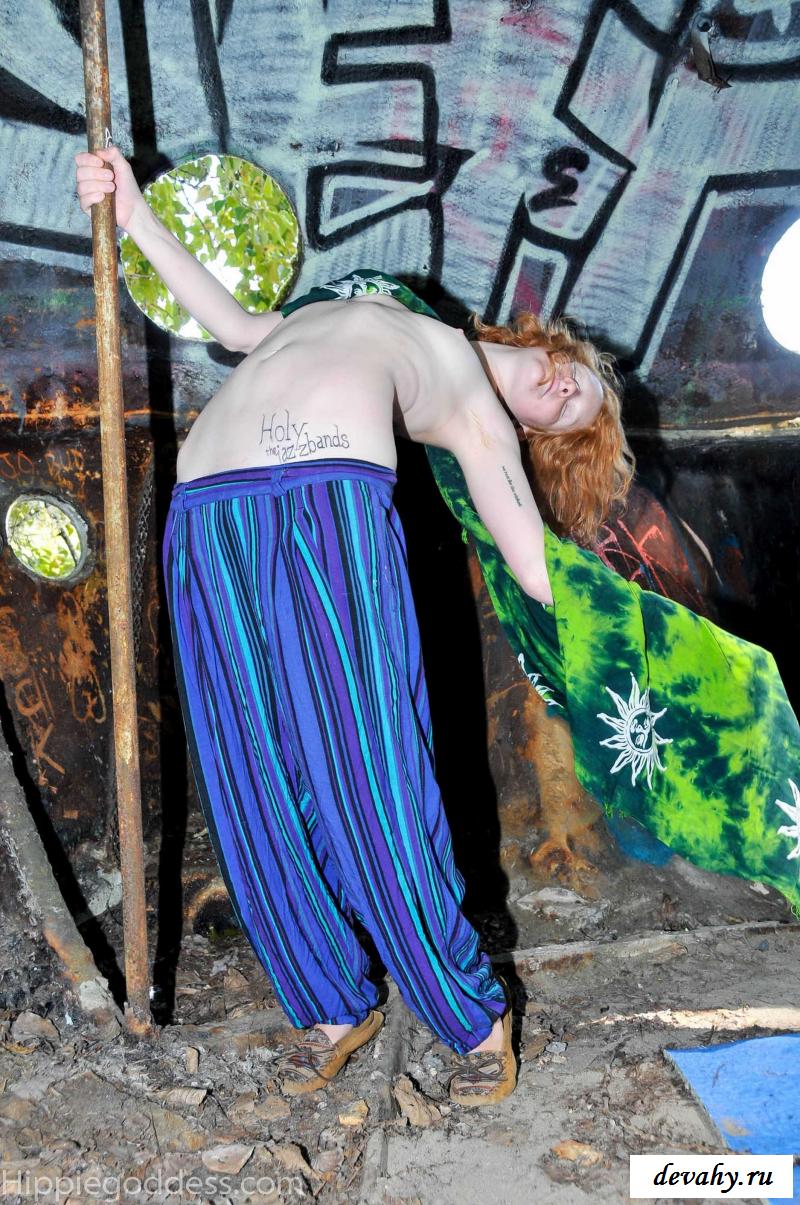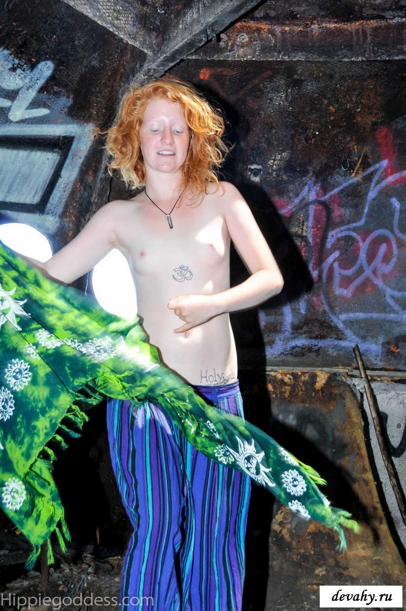 Привлекательная рыжеволосая хиппи, однажды нашла за городом старый разваленный дом с круглыми иллюминаторами и прямо там начала демонстрировать свои оголенные мелкие титьки. Это раздетой сучке сильно понравилось и она даже стала танцевать, слегка прикрыв верх своего тела разноцветным платком. Во время исполнения танца она также сняла свои широкие штаны, под которыми не было трусиков и скрывалась ее небритая молодая пизда.