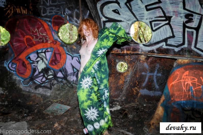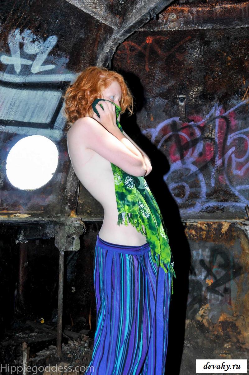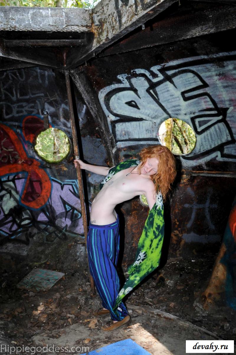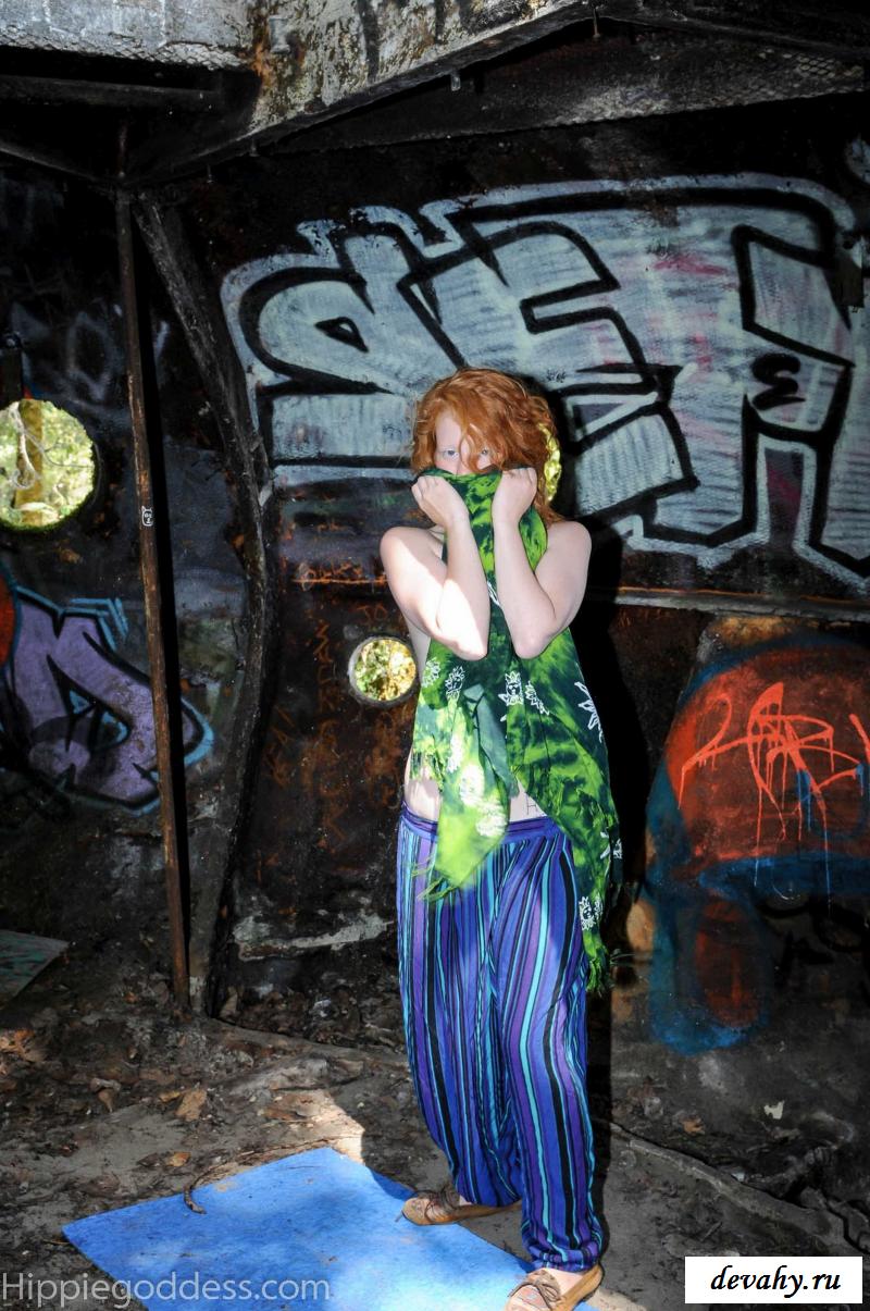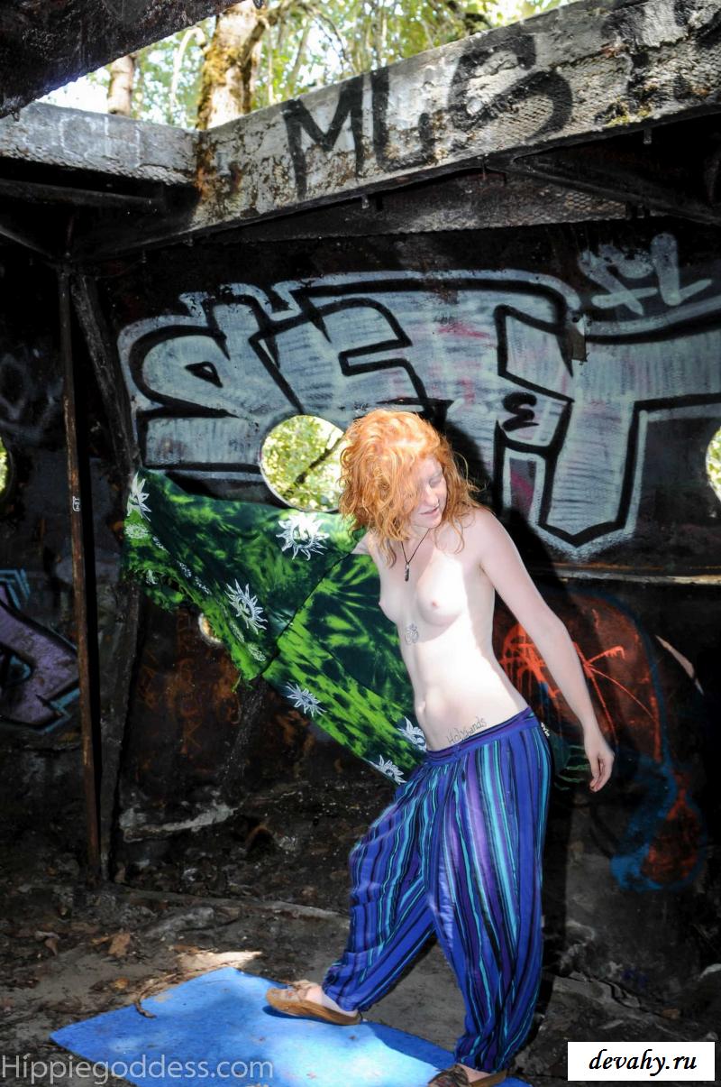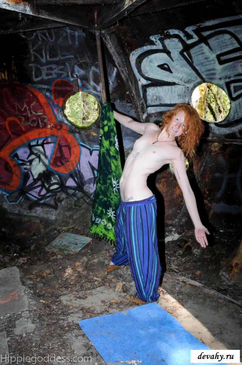Привлекательная рыжеволосая хиппи, однажды нашла за городом старый разваленный дом с круглыми иллюминаторами и прямо там начала демонстрировать свои оголенные мелкие титьки. Это раздетой сучке сильно понравилось и она даже стала танцевать, слегка прикрыв верх своего тела разноцветным платком. Во время исполнения танца она также сняла свои широкие штаны, под которыми не было трусиков и скрывалась ее небритая молодая пизда.
