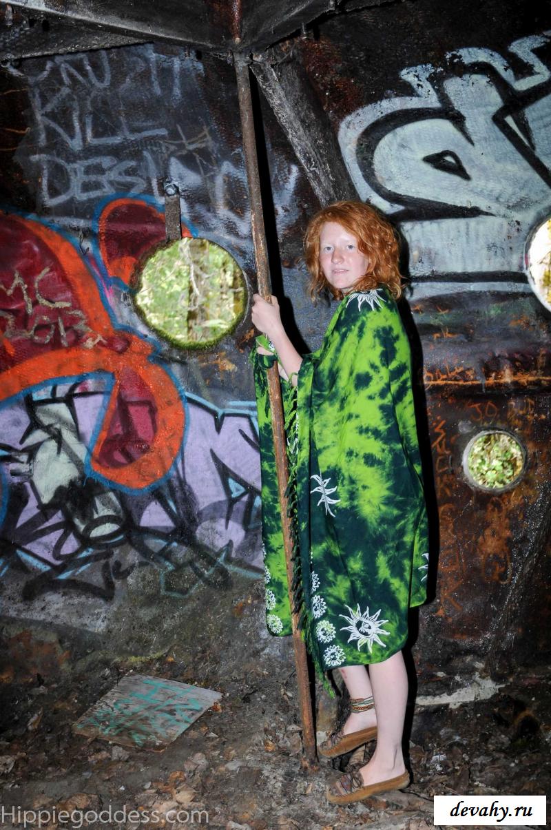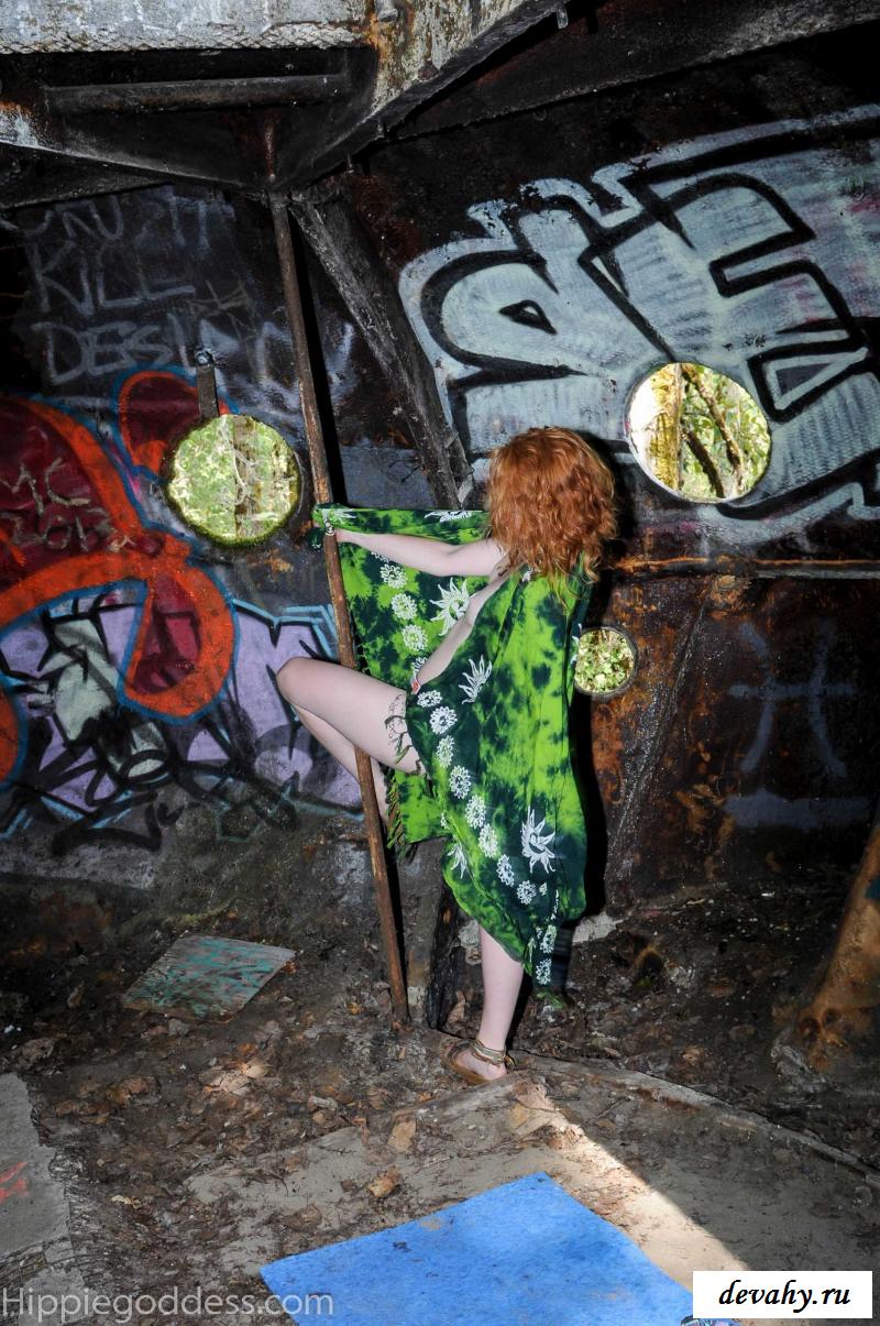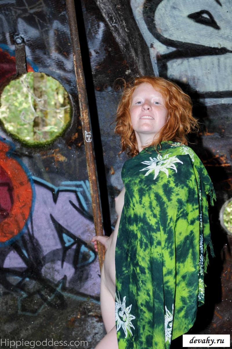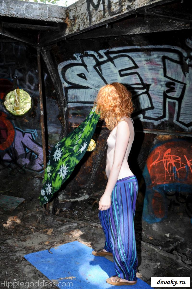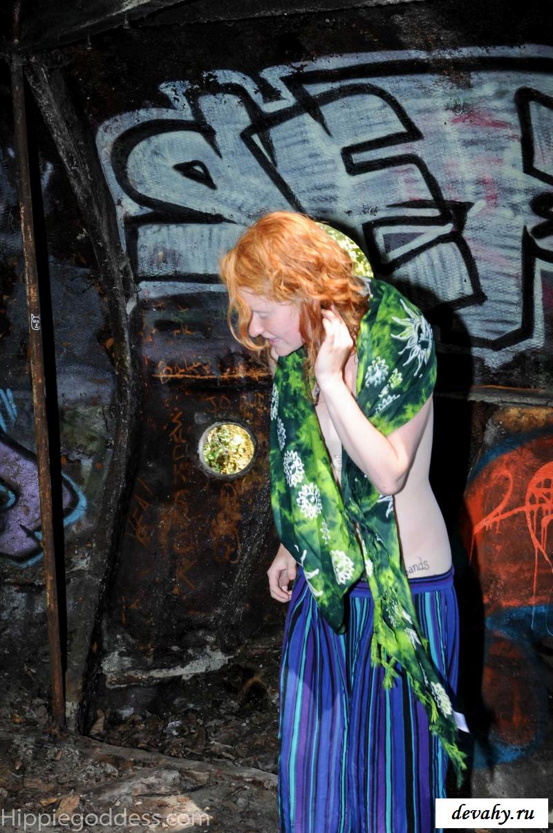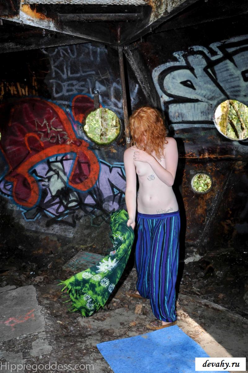 Привлекательная рыжеволосая хиппи, однажды нашла за городом старый разваленный дом с круглыми иллюминаторами и прямо там начала демонстрировать свои оголенные мелкие титьки. Это раздетой сучке сильно понравилось и она даже стала танцевать, слегка прикрыв верх своего тела разноцветным платком. Во время исполнения танца она также сняла свои широкие штаны, под которыми не было трусиков и скрывалась ее небритая молодая пизда.