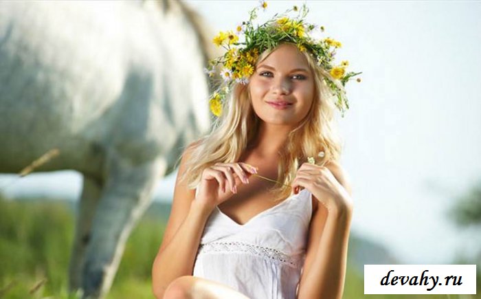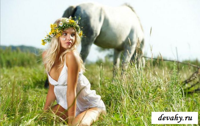 Очень красочные снимки на которых молоденькая эротичная блондиночка и лошадка совместно пасутся в этот ясный день. От таких фоток сразу поднимется не только самочувствие. Одета наша девочка в белые трусики и топик. Хохлушка собрала полевых цветов на поляне и свила себе симпатичный венок. Не надейтесь рассмотреть какую-нибудь интимную часть блондиночки - она не показывает вам даже грудь, только округлости обнаженных ягодиц видны. Эта подборка прекрасных простых и нежных фотографий для поднятия настроения.