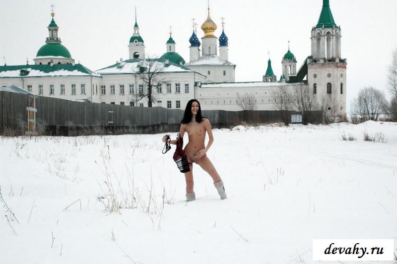 Развратная брюнетка очень сильно любит развлекаться на снегу. Однажды она взяла зеркальный фотоаппарат и направилась вместе со своей подругой в место, где не было людей. Там худая россиянка начала эротично позировать в обнаженном виде, трогая руками свое холодное тело. Эта минусовая температура смогла безумно возбудить сучки, после чего она как можно шире раздвинула свои ножки, и стала лапать бритую киску, а также засветила татуировку на лобке.