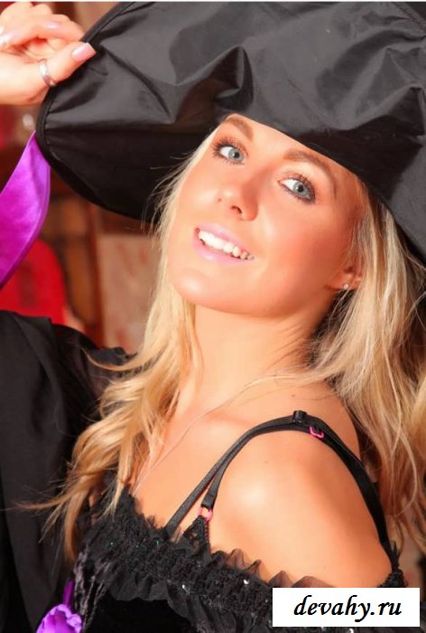 Прямо целое представление разыграла перед нами красивая блондинка. складывается впечатление что эта ведьмочка вылетела из камина на метле, от чего ее платье задралось обнажив попку и чулочки пристегнутые к пояску и это только начало. Развязывая на животе фиолетовую ленту, шальная девка начнет раздеваться, двигаясь в так е одной известной музыки. Бюстгальтер с трусиками будут очень изящно и эротично сняты. Теперь преграды нет, остается сохраняя спокойствие оценить ее грудь с попкой.