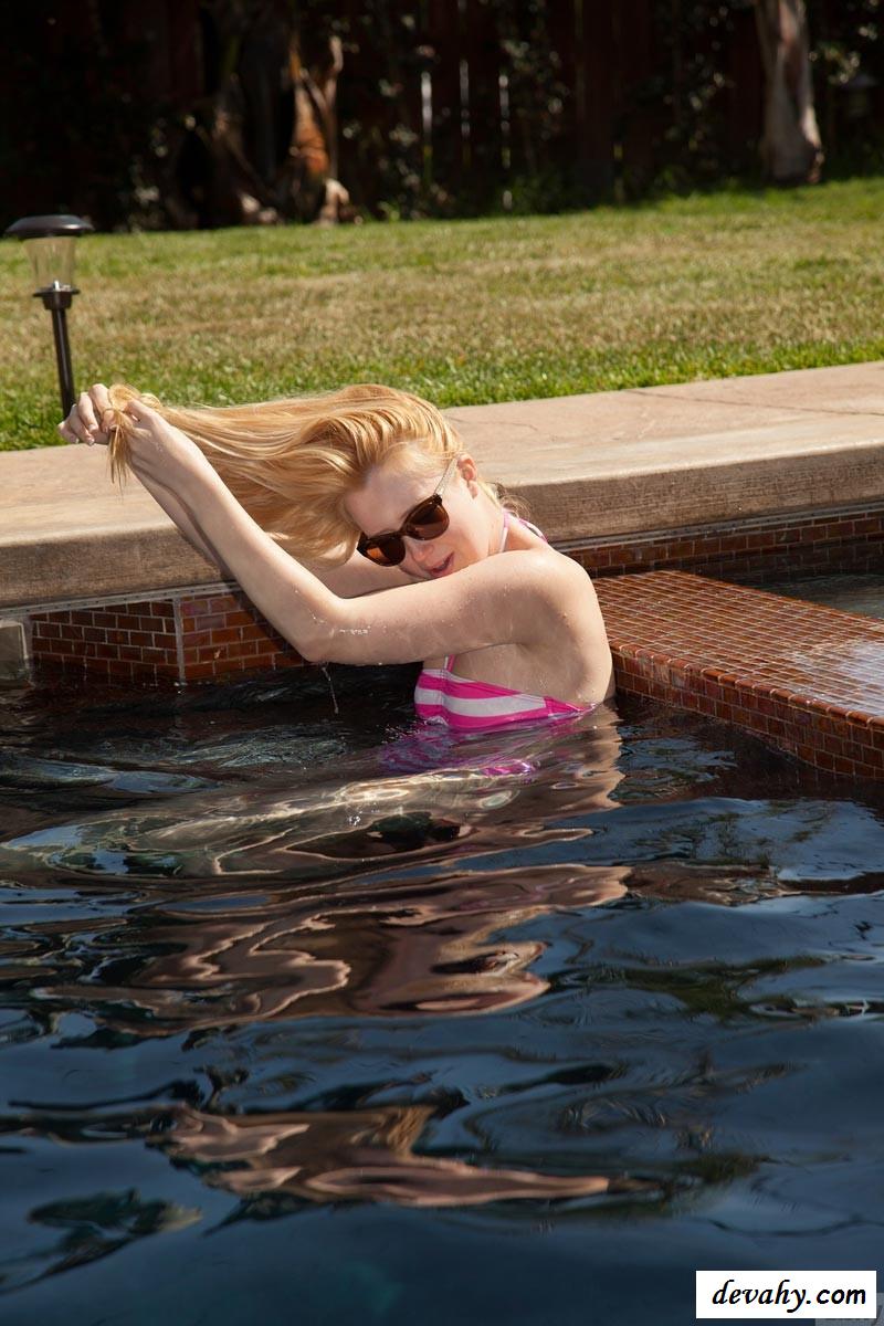 Роскошная сучка в полосатом купальнике решила начала купаться в своем бассейне, соблазняя при этом мужиков, смотрящих на нее. Обнаженная блондинка сразу же после того, как окунулась в теплую воду, стала снимать с себя постепенно плавательный костюм. И в результате этого ее титьки стали полностью голыми, а она их в свою очередь начала прикрывать влажненькими руками. После чего милашка вылезла из воды, и уже смогла засветить их во всей красе, и можно было понаблюдать за тем, как медленно стекают капельки холодной жидкости по ее упругим соскам.