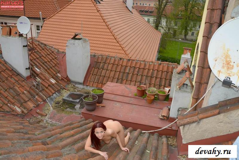 Раздетая развратная рыженькая извращенка любит удивлять своих соседей, чтобы те любовались ее стройным телом. Сегодня она вылезла прямо на дом и в обнаженном виде и стала там развратно себя вести. Стоя на крыше сучка, поворачивалась задницей к объективу фотокамеры, и хитро улыбаясь, не забывая держаться за дымарь. Затем европейка и вовсе присела на холодную черепицу возбужденной пиздой и стала тереться об ее поверхность.