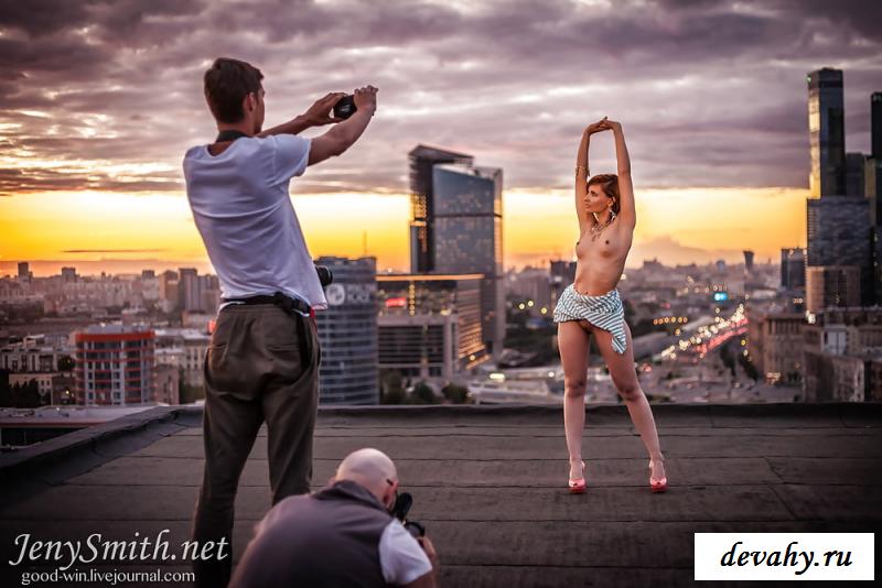 Обнаженное тело фотомодели на крыше смотрелось идеально, особенно когда телочка приняла решение стянуть из себя всю одежду. Все это развратница делала на фоне красивого вечернего города. И изначально она планировала слегка приподнять голенький задок, который в этот момент был без трусов, стоя на кровле в светлых туфлях на высоком каблуке. Но потом рыжей захотелось еще больше раздеться и она показала отличные титьки и при этом стоя рядом с огромным мегаполисом.
