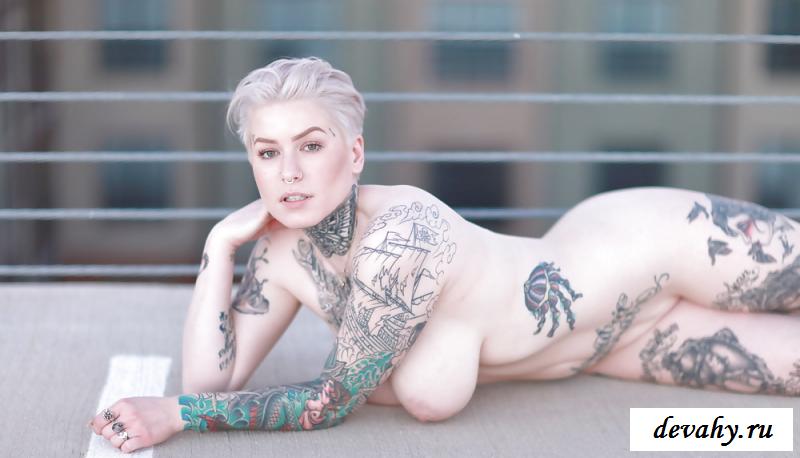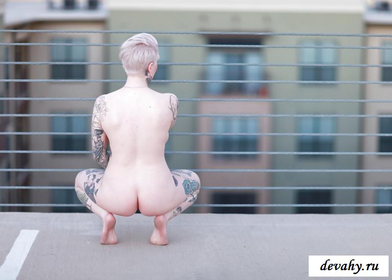 Татуированная манекенщица однажды взобралась на высотное здание и захотела там устроить эротическую фотосессию. Придя туда она уже была полностью без одежды и поэтому сразу же на крыше стала демонстрировать свои роскошные формы. И как только девица стояла ровно, то сразу же было видно, как отлично свисают ее натуральные дыньки пятого размера. Но на фоне красивых грудей ее бритая пизда смотрелась еще лучше, особенно на фоне стройных ножек, покрытых необычными татушками.