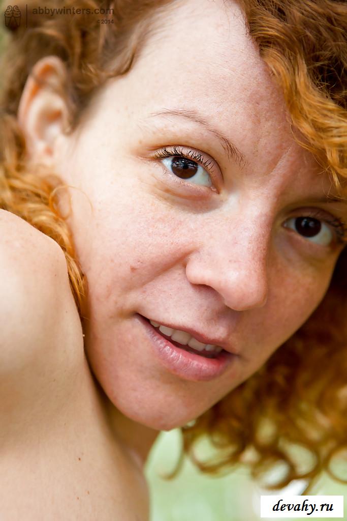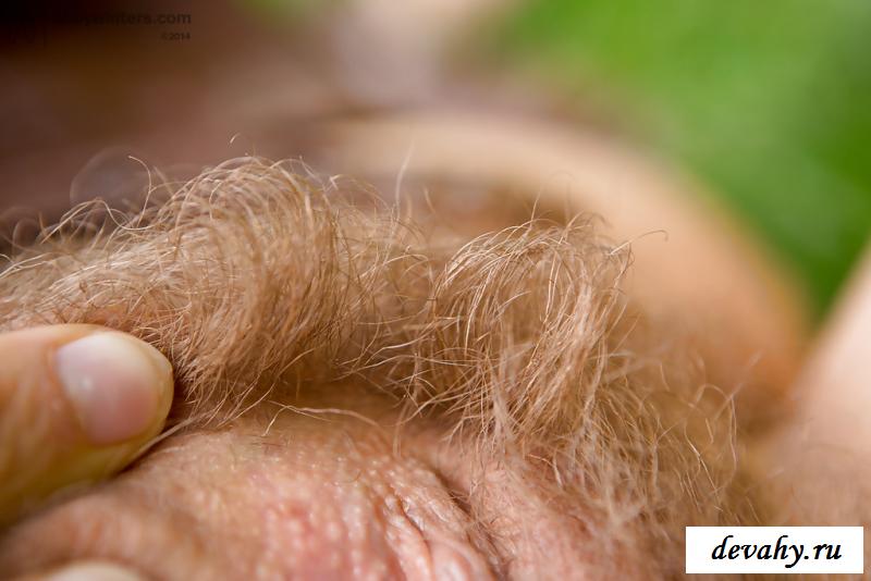 Рыжая кудрявая проститутка решила отправиться на природу, чтобы там хорошенько расслабиться и отдохнуть. И когда она стала отдыхать на траве, то ей сразу же захотелось избавиться от верхней одежды и нижнего белья. И уже без своих тонких трусов раздетая легла на попку и стала ласкать нежными пальчиками заросшую киску, которая отлично выглядела во всех ракурсах, даже несмотря на то, что этой шалаве уже больше сорока лет.