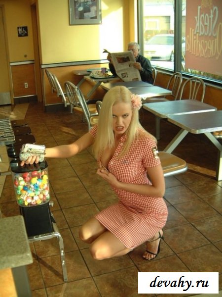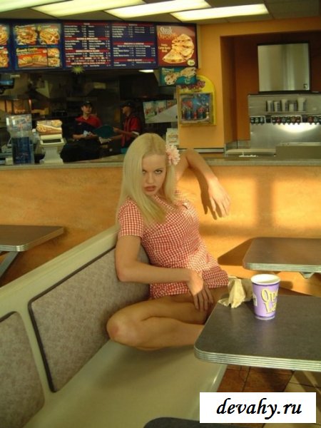 В клетчатом простеньком платье, телочка зашла в забегаловку перекусить. В ожидании заказа она не скучает, а развлекается тем, что раздвигает ножки, выставляя бритую пилотку с попкой на обозрение, молодая телочка знает, что своими прелестями привлечет внимание